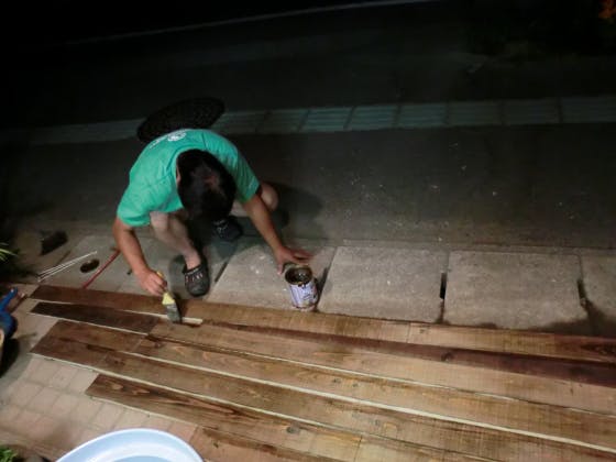 この写真は今回の地震でタイルが剥がれてしまいなんとか直そうとぬき板を張りペンキを塗っているところです。僕らの考えに賛同してくれて色々手伝ってくれています。