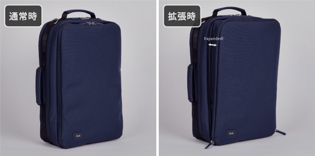 「Stolt Podium」のフロントコンパートメントはそのサイズを荷物の大きさに応じて拡張可能です。一般的な靴にも対応するサイズに拡張できるので、革靴やジム用のトレーニングシューズなど、あなたのアクティブタイムを切り替えるのに余計なバッグの必要がありません。またシューズ類をダイレクトに入れても問題ないように、内側に抗菌処理が施されています。