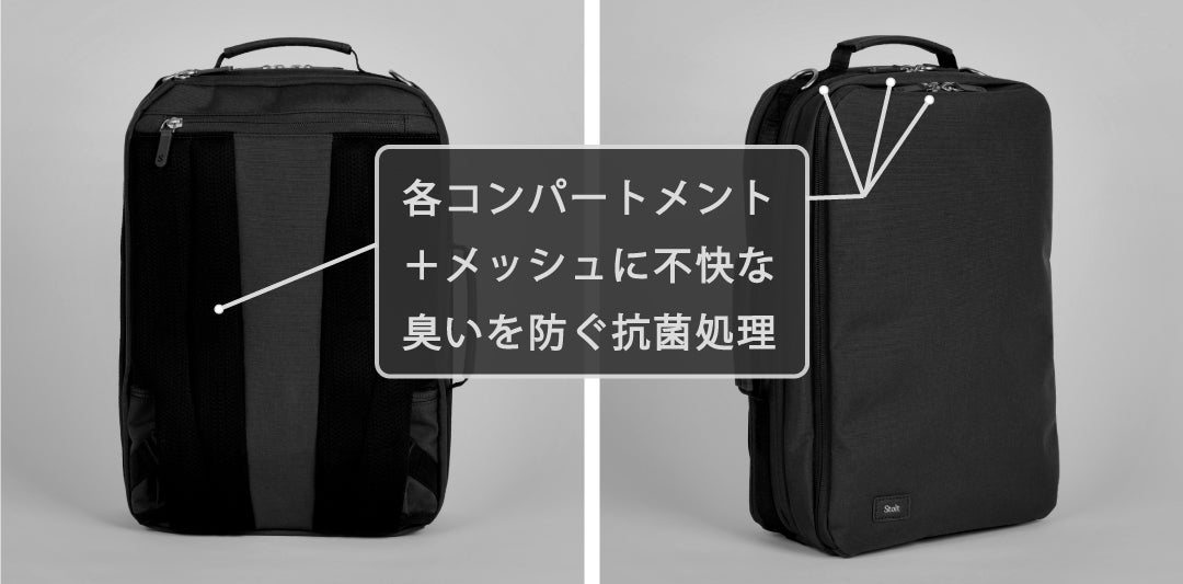 各コンパートメント内部と、バックパック背部のメッシュ部分にはバイオロジカルな抗菌処理が施されており、汗による不快な臭いの発生やその他悪臭の付着を防いでくれます。