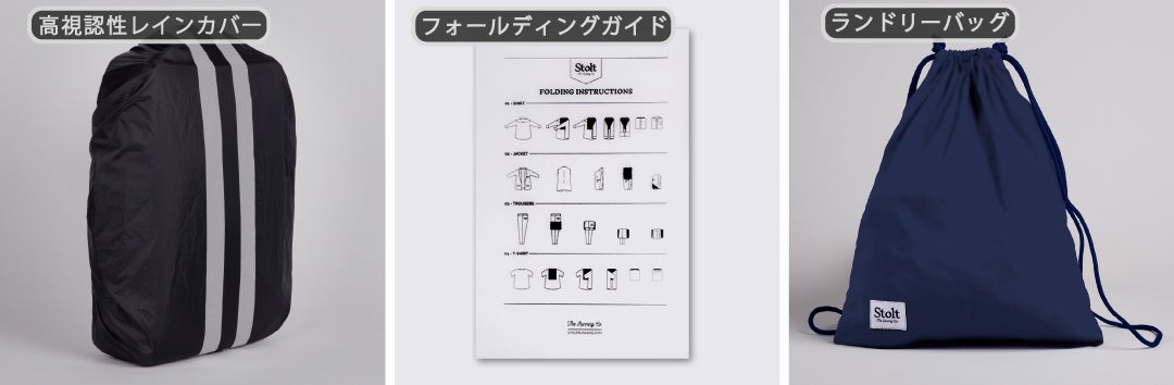 STOLT PODIUMのリターンコースには以下のレインカバー・フォールディングガイド・ランドリーバッグが付属したフルセットプランがあります。