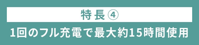 - 1回の充電で約3~15時間の動作が可能な大容量のリチウムイオン充電池を搭載しました。電池残量を気にすることなく、快適に使えます。