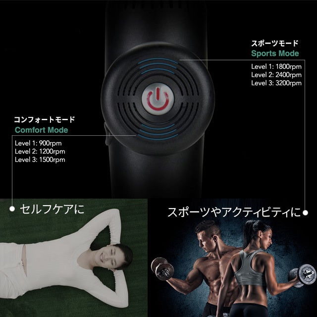 「ELEEELS X1(エレイールス エックスワン)」には6段階のスピード設定があります。アクティビティの前後に最適なスポーツモード、セルフケアタイムに最適なコンフォートモードモードがあり、それぞれ3つの段階を備えています。1分間に最大3200ストロークを繰り出し、モードを変更すると1段階から6段階まで振動数を細かく調整できるので、多様なニーズに応えます。 -