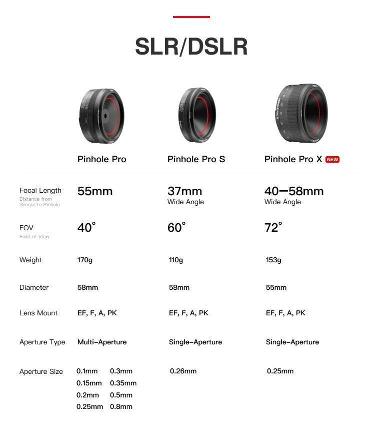 一眼レフカメラ用の「Pinhole Pro X for SLR/DSLR」は、Canon EF、Canon EF-S、Nikon F、Sony A、Pentax KAF2のレンズ規格に対応。ミラーレスカメラ用の「Pinhole Pro X for Mirrorless」は、Sony E、Fuji X、Micro 4/3のレンズ規格に対応しているので、ほぼ全てのカメラのマウントで使用ができます。