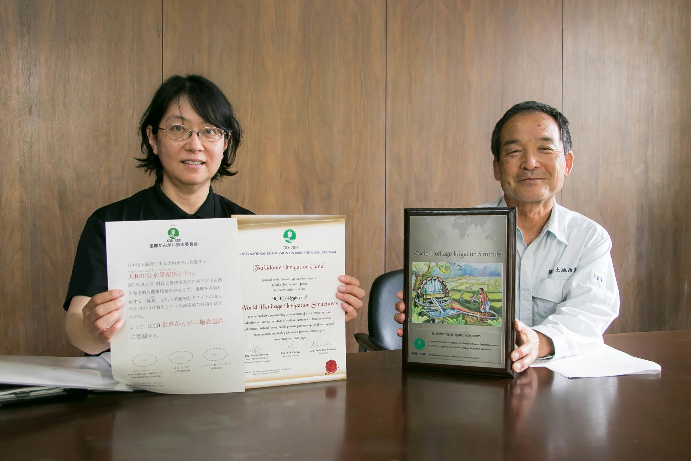 「『世界かんがい施設遺産』の登録は、一筋縄ではいかなかった」と話してくださったのは、登録で中心となって尽力した、築留土地改良区の仲谷事務局長と、大阪府 中部農と緑の総合事務所の馬場総括主査のお二人。認定された今年は3度目の応募だったのだそうです。