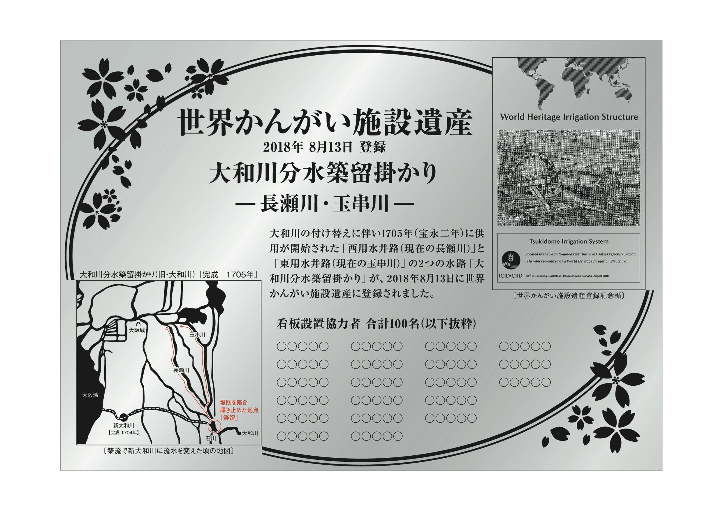 「大和川分水築留掛かり~長瀬川・玉串川~」が世界かんがい施設遺産の登録を受け、歴史的、技術的、社会的価値のある施設として認められたことを、もっと皆さんに知っていただきたく、記念看板を設置します。