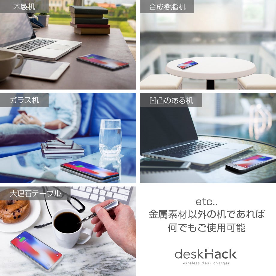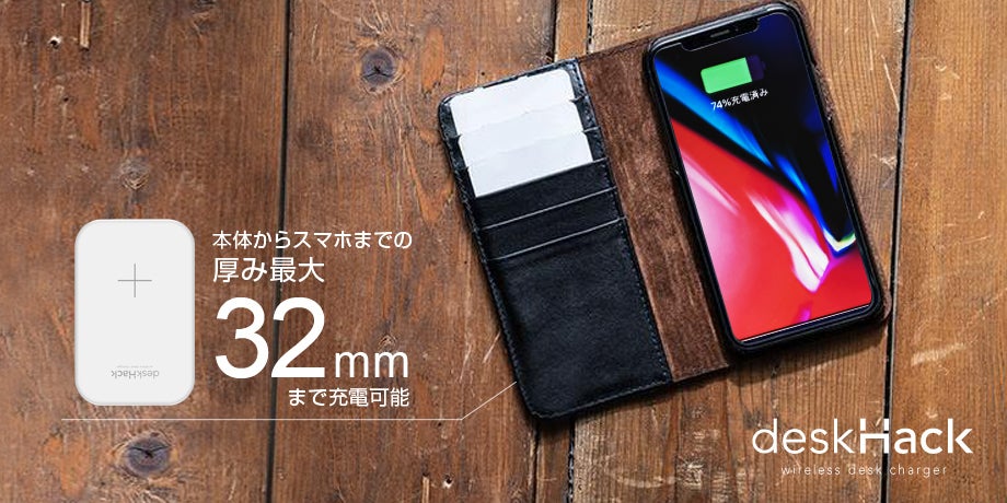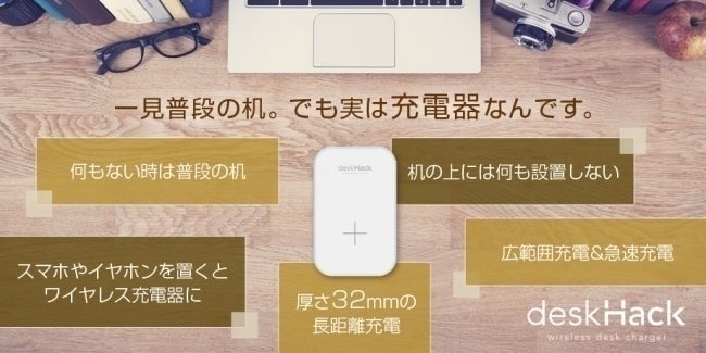 家に帰ってふと座った時、テレビを見ている時、パソコンを触っている時、スマホを机に置くだけで自動的に充電されるそんな夢のような充電器 『deskHack』が登場しました。