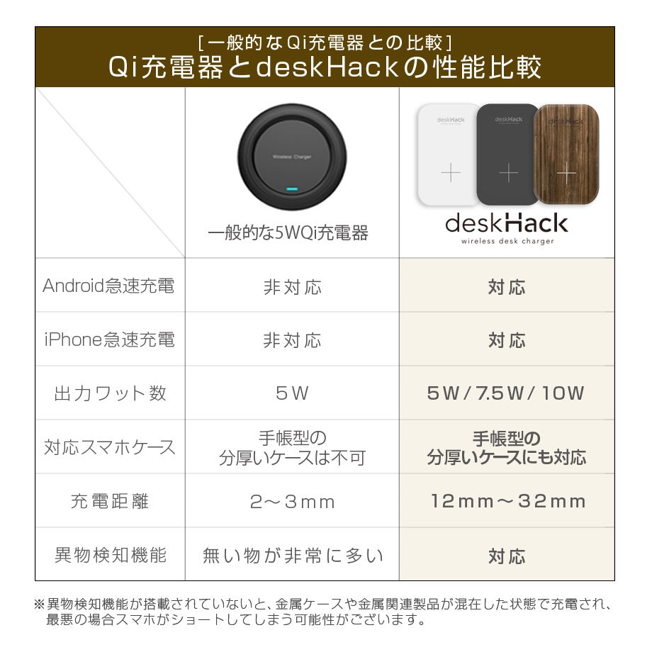 ※金属製の机および金属製のスマホケースを着用しての充電はQi充電の仕様上、非対応となります。Qi充電の安全装置が作動し、Qi充電が行われません。