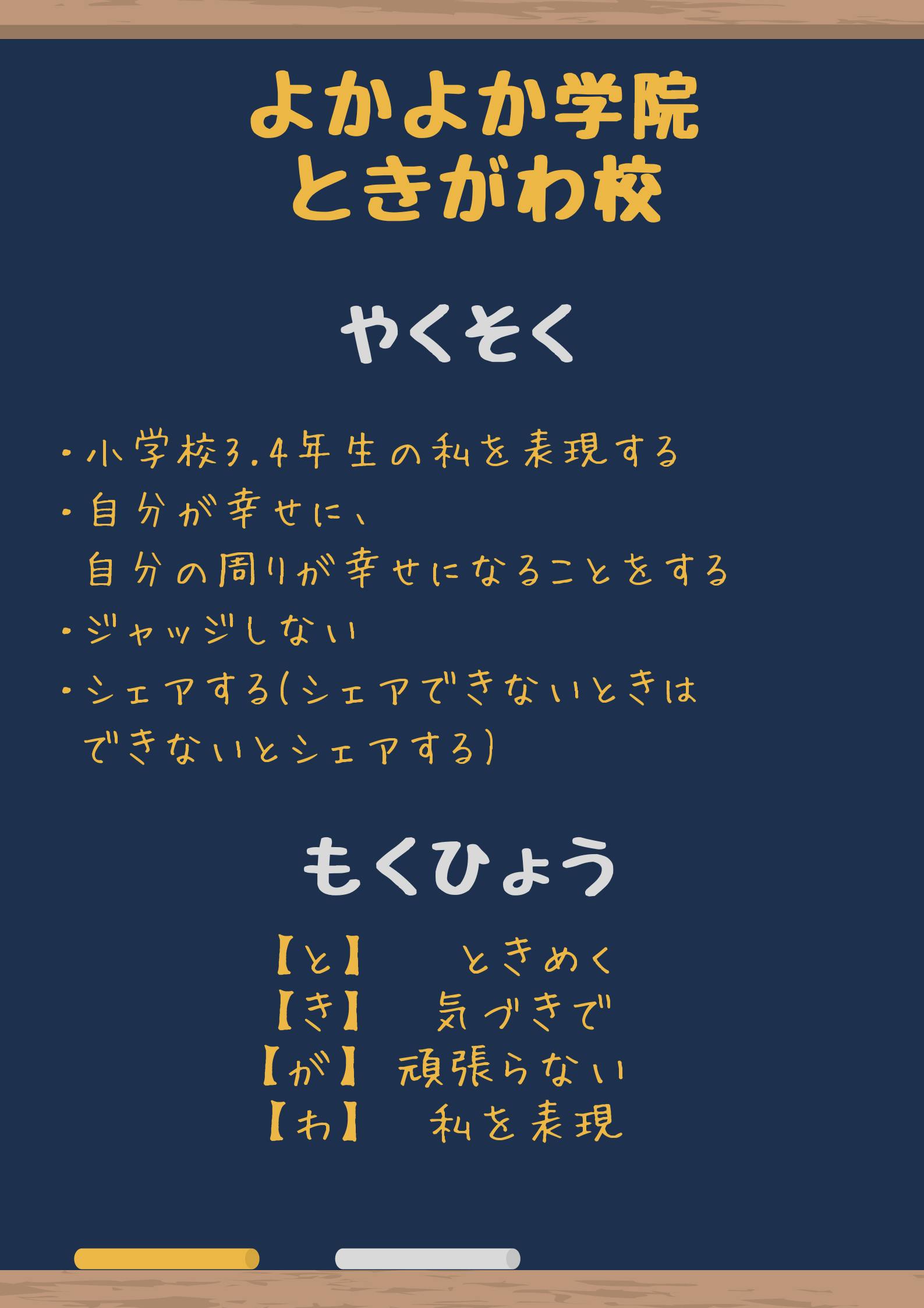 おかあさんは、いつも誰かのために頑張っています。 自分のことはそっちのけにして。いくら頑張っても、なんか違う。 私もその1人でした。 よかよかに出会い、自分を大切にして良いことを実感しました。 「おかあさんの幸せは家族の幸せ。」 あなたが幸せになること、 周りが幸せになること、 この2つを満たすことをすると、自然とみんながそれをやり始めるという調和。 「係の時間」 自分たちが幸せになることを知り、表現していくリアルな場が、よかよか学院ときがわ校です。 自然豊かで、暖かい雰囲気の方が多いときがわ町で、 子供の頃から大好きだったこと、やりたかったこと、をどんどんやっていけたらなーと思っています。 やりたいの原動力、 やりたいをやる集中力、 大好きを表現するパワー。 それに心が動かないわけがありません。 そんな場を作ります。 学校という形で。