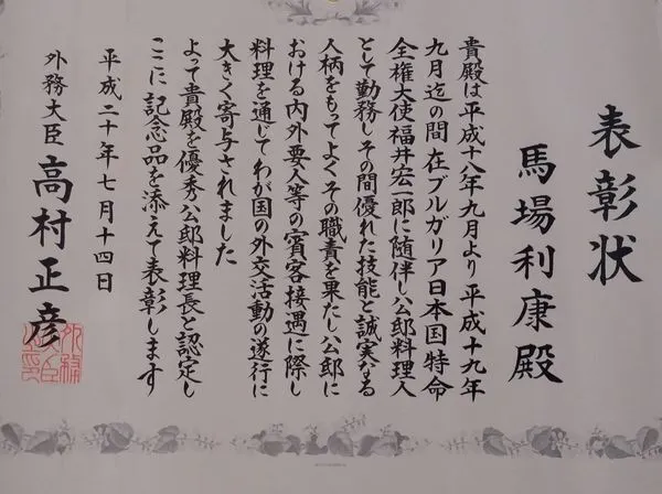 功績が認めらえ、平成20年には、外務大臣認定優秀公邸料理長の称号頂きました。
