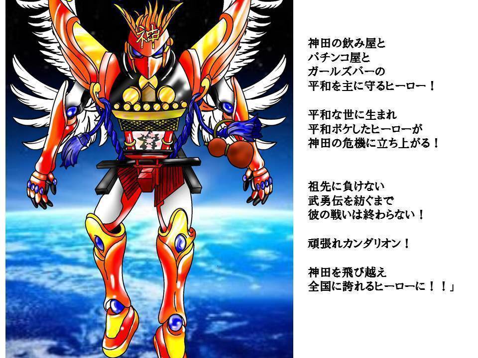 その意志は息子カンダリムに受け継がれ高度経済成長の日本を支え、戦後80年の平和の礎を築いた。そして1980年代、日本の経済が絶頂期を迎え時はバブル経済の真っただ中、何の苦労もない時代、人々が飢餓、戦火とも無縁の平和ボケした時代にカンダリオンはこの世に生を受け、先祖の苦しみも知らず今日も神田の街で飲み屋とパチンコ屋とガールズバーの平和を守るために日々尽力しているのだ!!