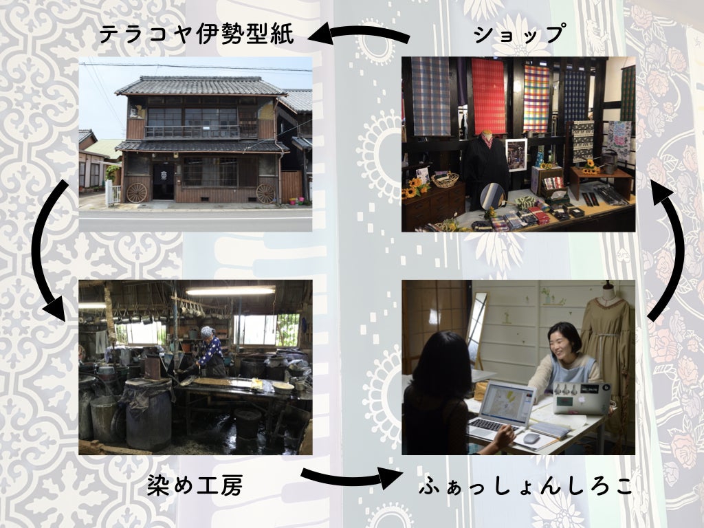 後継者育成を目的とした型紙、デザインを制作できる場(テラコヤ伊勢型紙)、染め工房、商品開発も行える服飾のコワーキングスペース(ふぁっしょんしろこ)、ショップの4つの空間です。