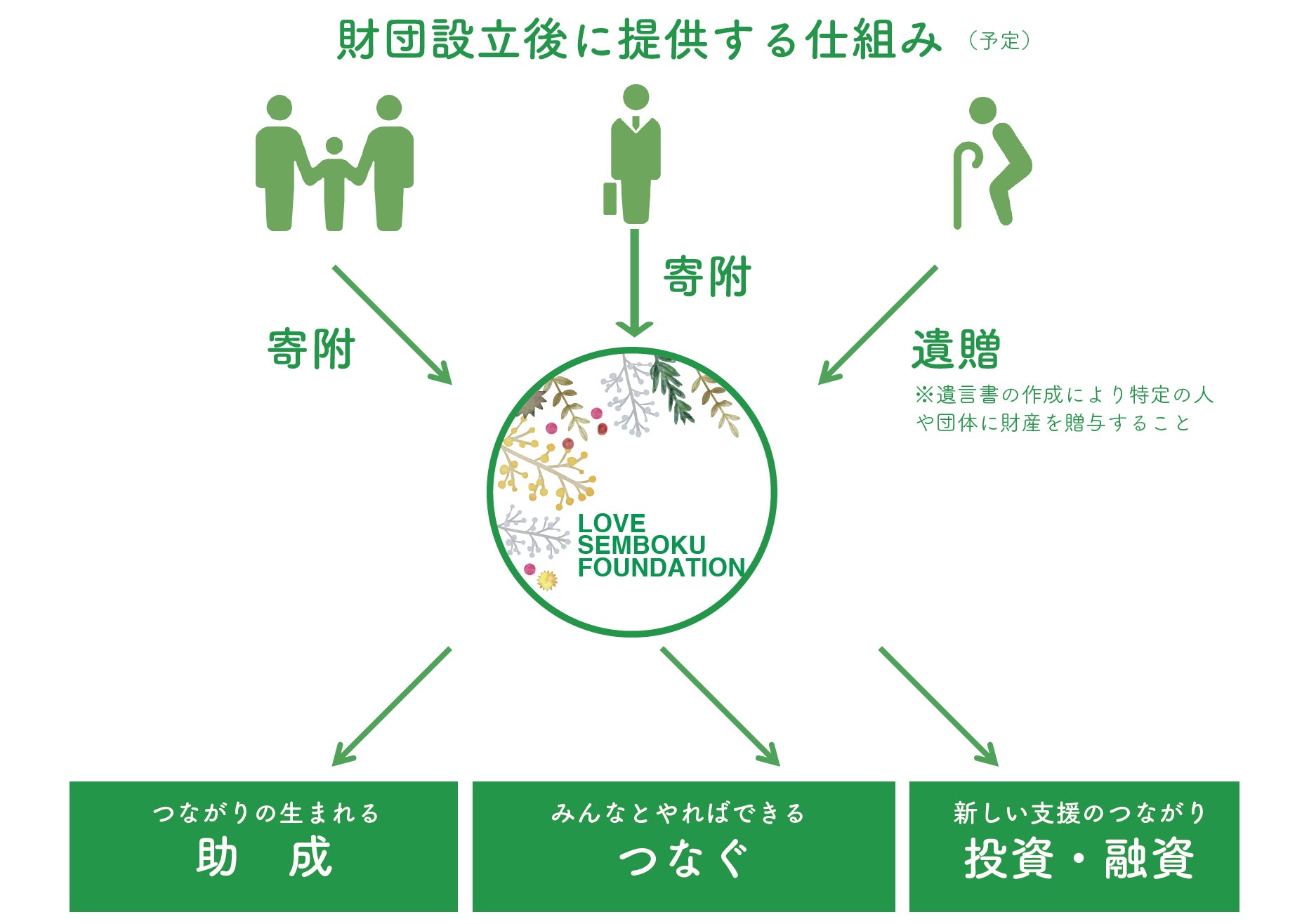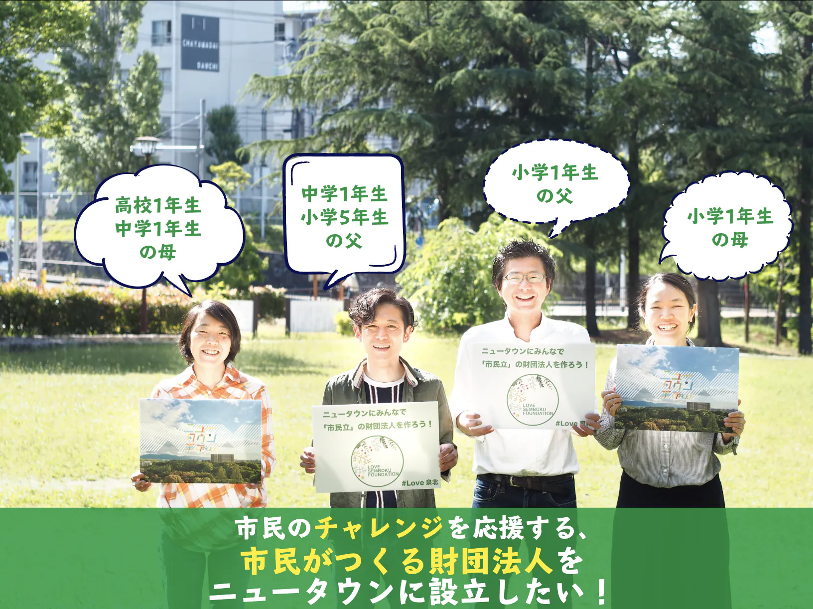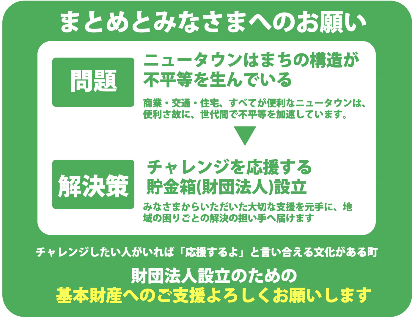 応援のカタチを未来の希望に変えていくために「まち」のポテンシャル(⼈・モノ・お⾦・情報などの資源) をつなぎ、⾒える化しこれらを「財産」として、シェアできる、まちのための公益財団法人をニュータウンに設⽴することを⽬指して、財団法⼈の設⽴の基本財源として、泉北内外のみなさんからの支援を結集し、公益財団法⼈をニュータウンに設⽴します。