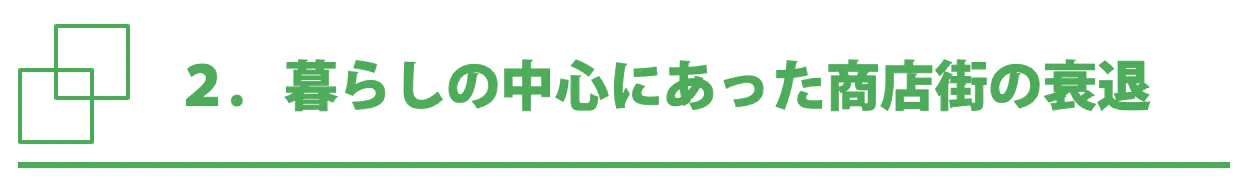 原因ははっきりしています。交通機能の充実により、住民は自分の街より良いものを売っている近くの街まで、車で出て行ってしまう事になります。ストロー現象が進み、街がスカスカになり、商店街(近隣センター)の機能が変化してきています。