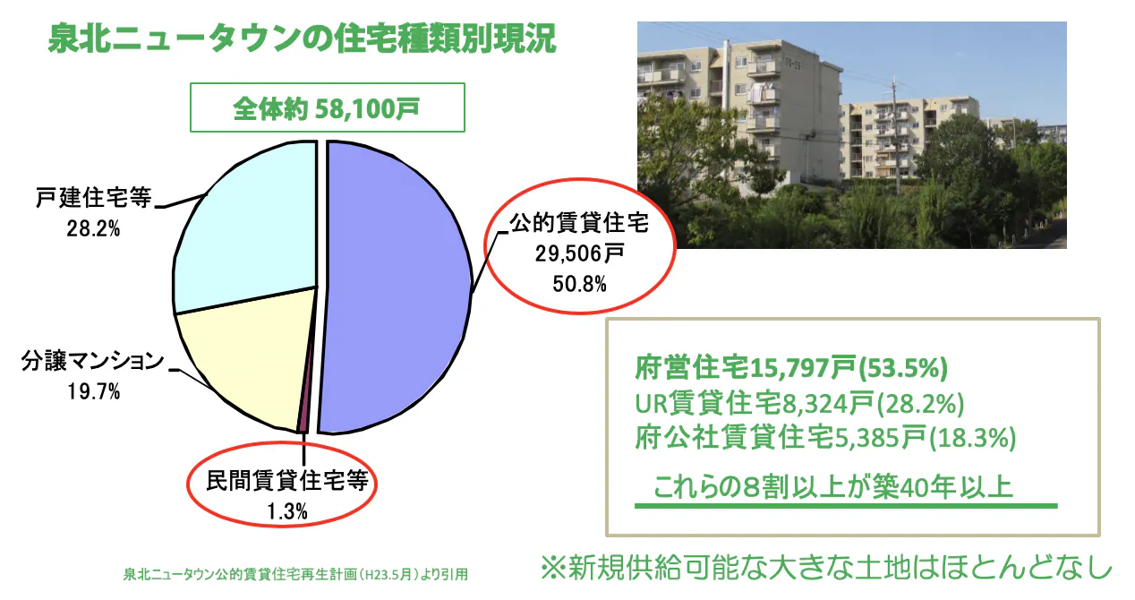 ニュータウンにおいて、高度経済成長を支えるための住宅供給が優先され、効率的な住宅戸数確保の観点から、当初は団地の住宅は室数も各室の面積も抑制され、入居家族モデルは核家族でした。そのために、三世代以上の同居は困難でした。泉北ニュータウンでは、特に顕著な課題として全住戸にしめる団地の割合が50%ということです。