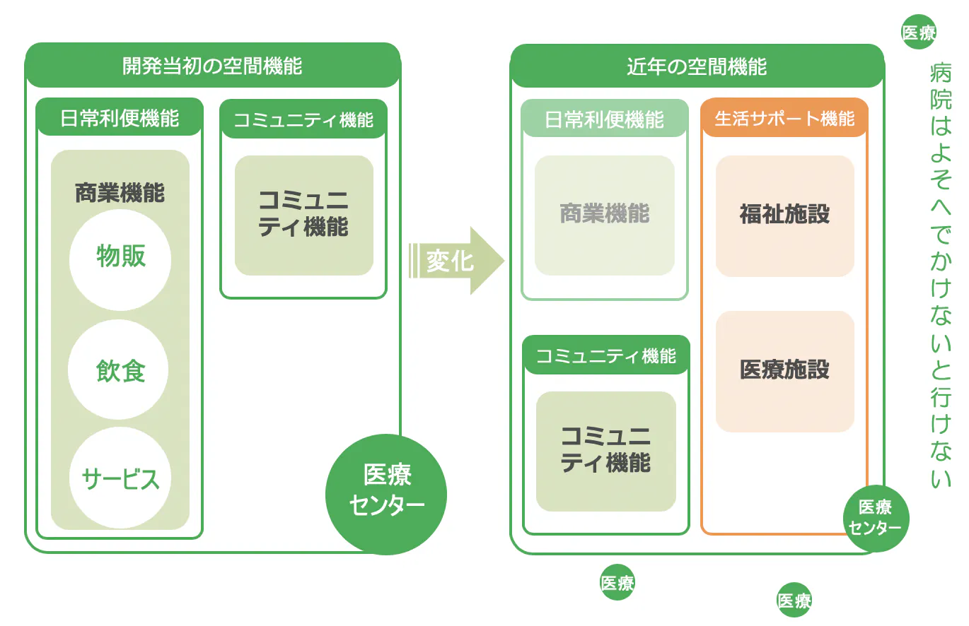 日本のニュータウンは、「近隣住区論」という考え方に基づき、まちの中心に商業施設と地域会館を配置し、日常の便利機能とコミュニティ機能を補完する存在として機能してきました。