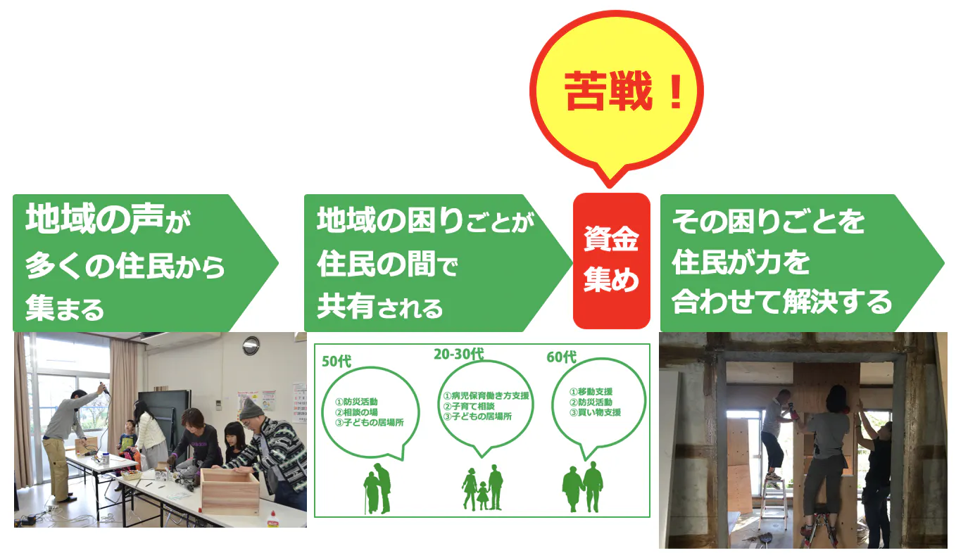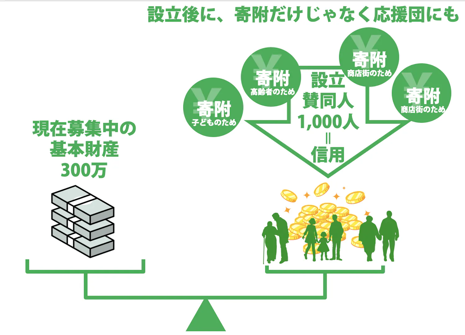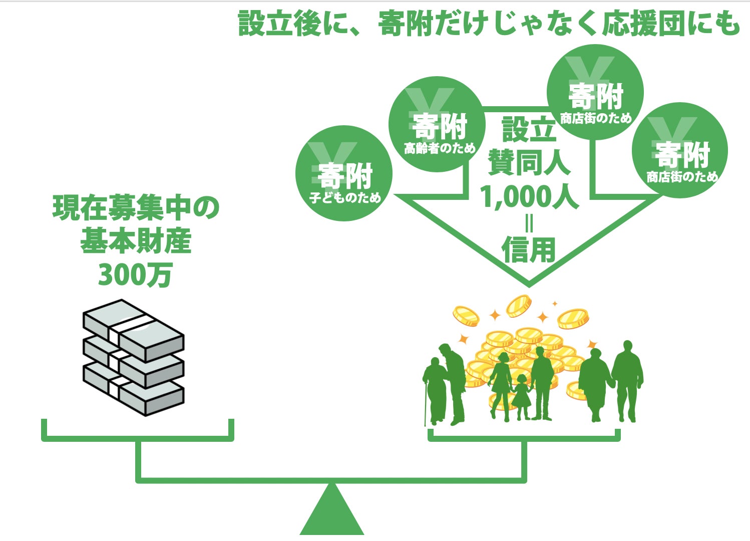 基本財産をなぜ、1000人から3000円の支援を集めているかと言うと、多くの方の協力で支援があつまることで、信用を生み出します。つまり、事業開始すぐにまちの応援団が生まれていることにつながると考えるからです。