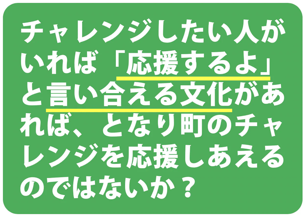 決定的な課題は、、、同じような課題を抱えているのに、まちごとにチャレンジを応援する文化が育っていないことでした。