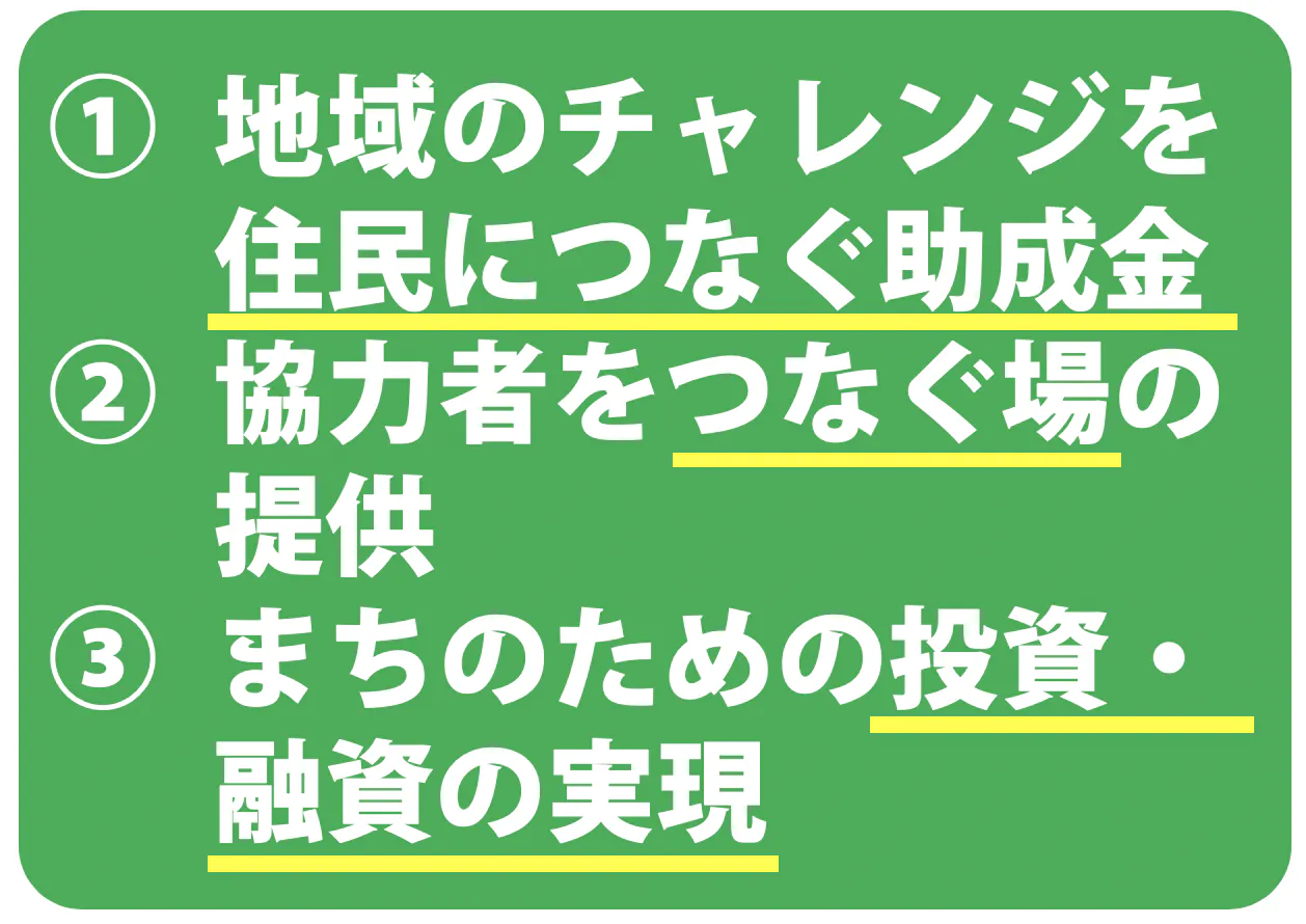 資金面からの応援とは具体的にいうと、お金という形で支援を基金で一旦お預かりし、そこから、これからの未来をつくっていこうとする様々な活動をさらに継続したり、事業が広がっていけるように、融資や投資、そして助成などを行います。