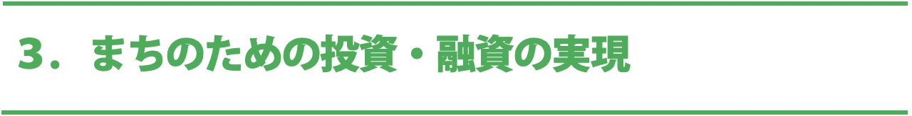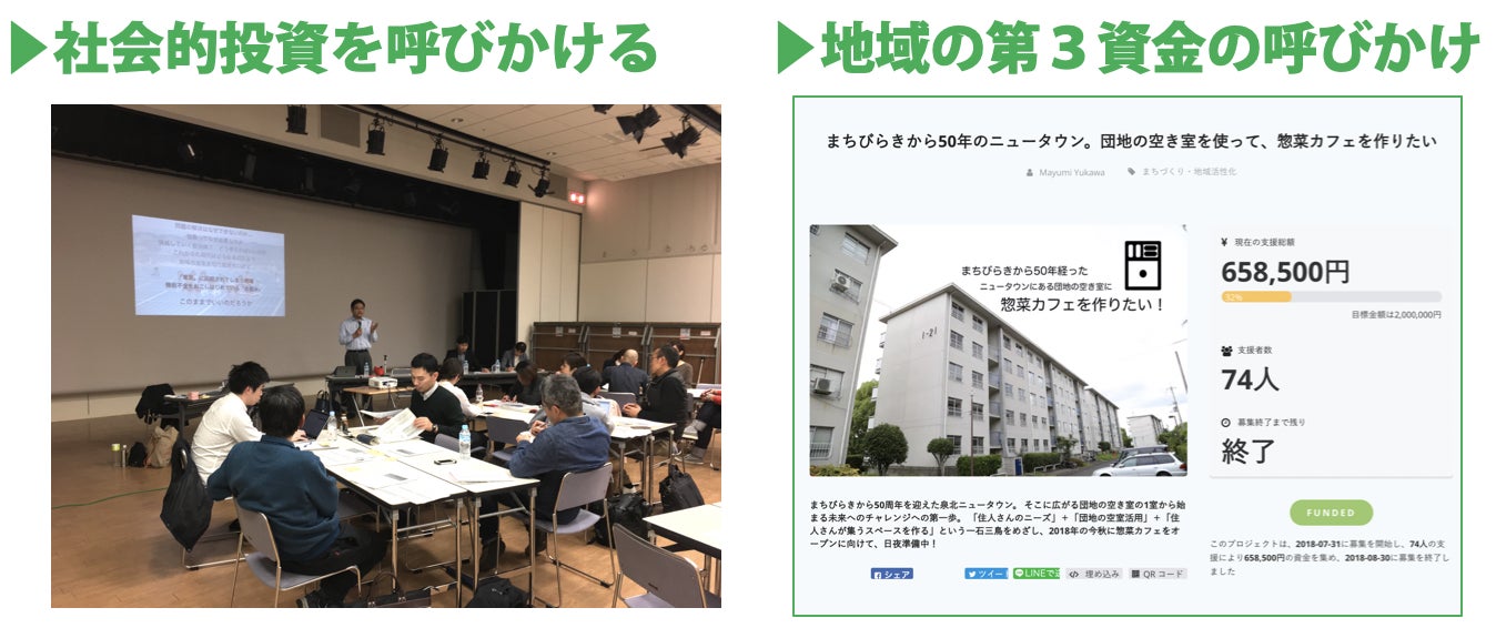 事業に参画する一つの方法としてお金を出し合い投資の仕組み「社会的投資」を使って、参画の場面を増やします。また、これまで行政の補助金・助成金で賄われてききた事業を、個人や機関投資家からの投資を推進・増加させるサービスとして、地域の新しい第3の資金を呼びかけていきます。