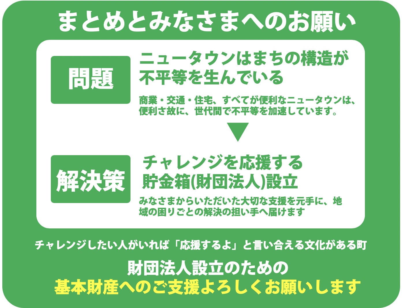 これからの僕たちの挑戦を応援していただくことで、ともにニュータウンで育つ子どもたちが希望を持てる社会をつくりませんか?