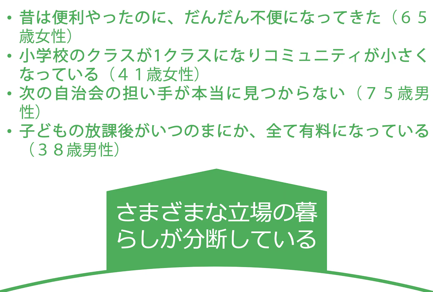 まさに、地域の声が多くの住民から集まり、地域の困りごとに寄り添い、住民の間で次のチャレンジが見出される状況が必要です。