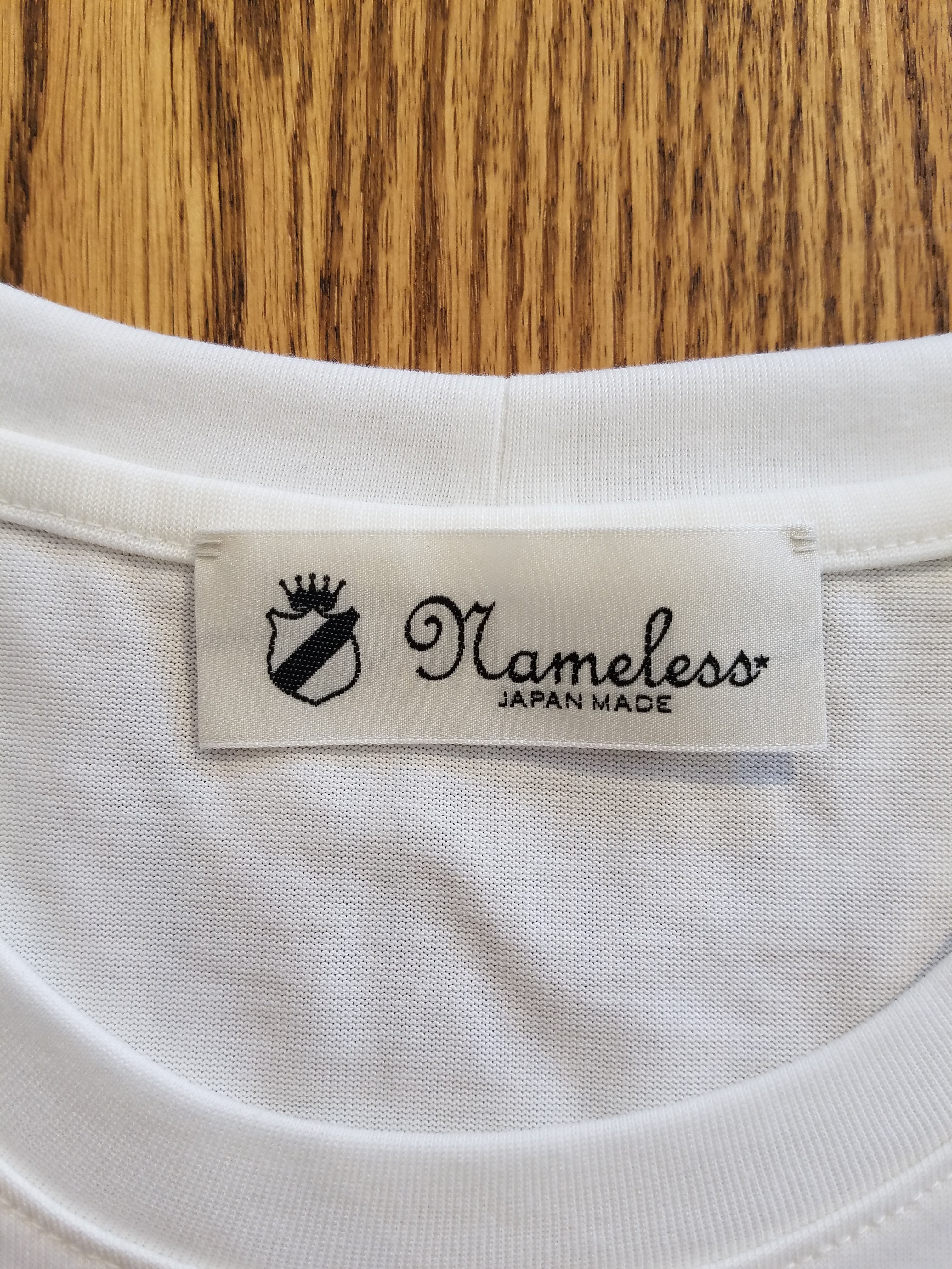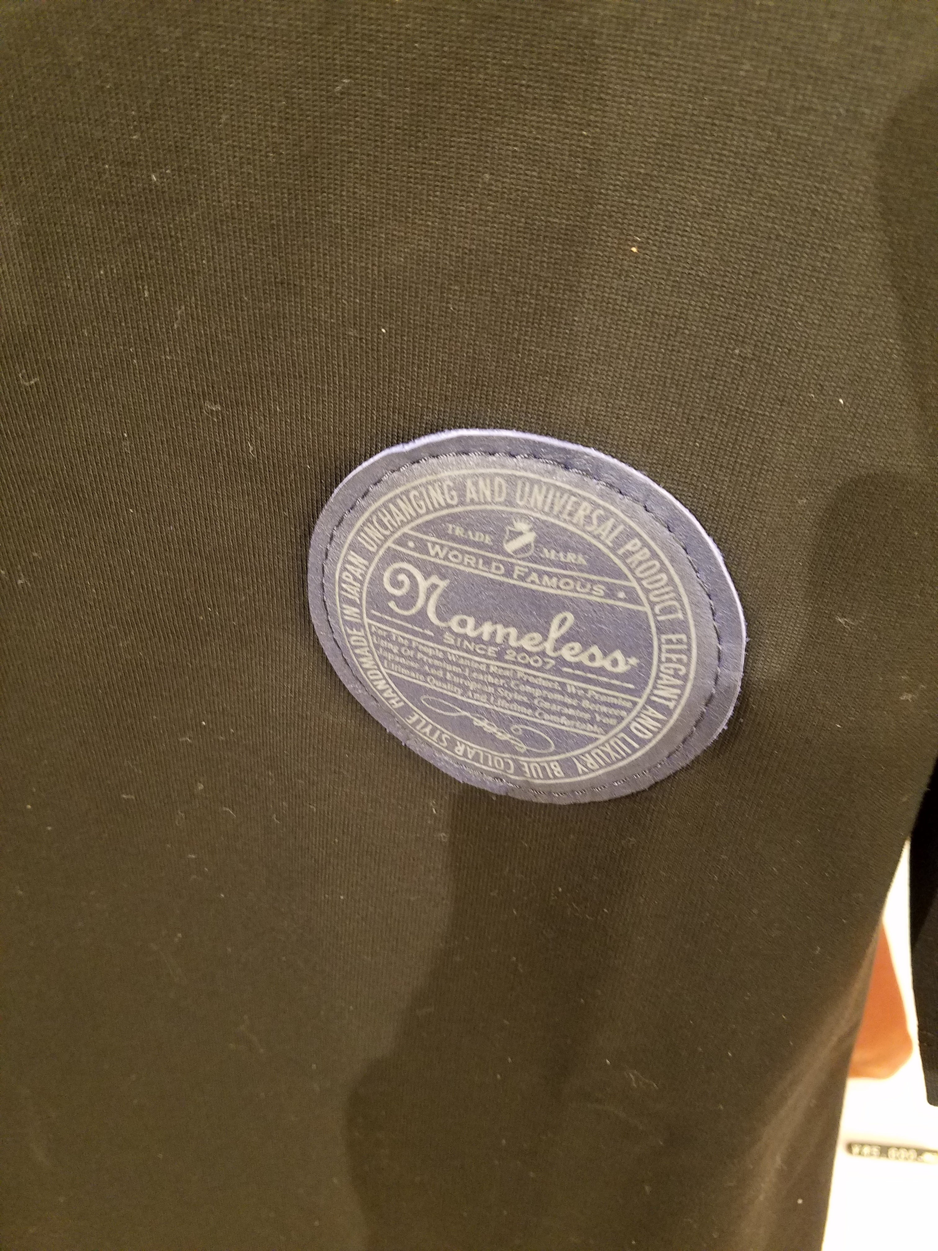 シルエットは若干肩が落ちるサイズ感。オーセンティックなボックスシルエット。ネームタグも日本製。手縫いにて裏に干渉しないよう二点止めで仕上げています。