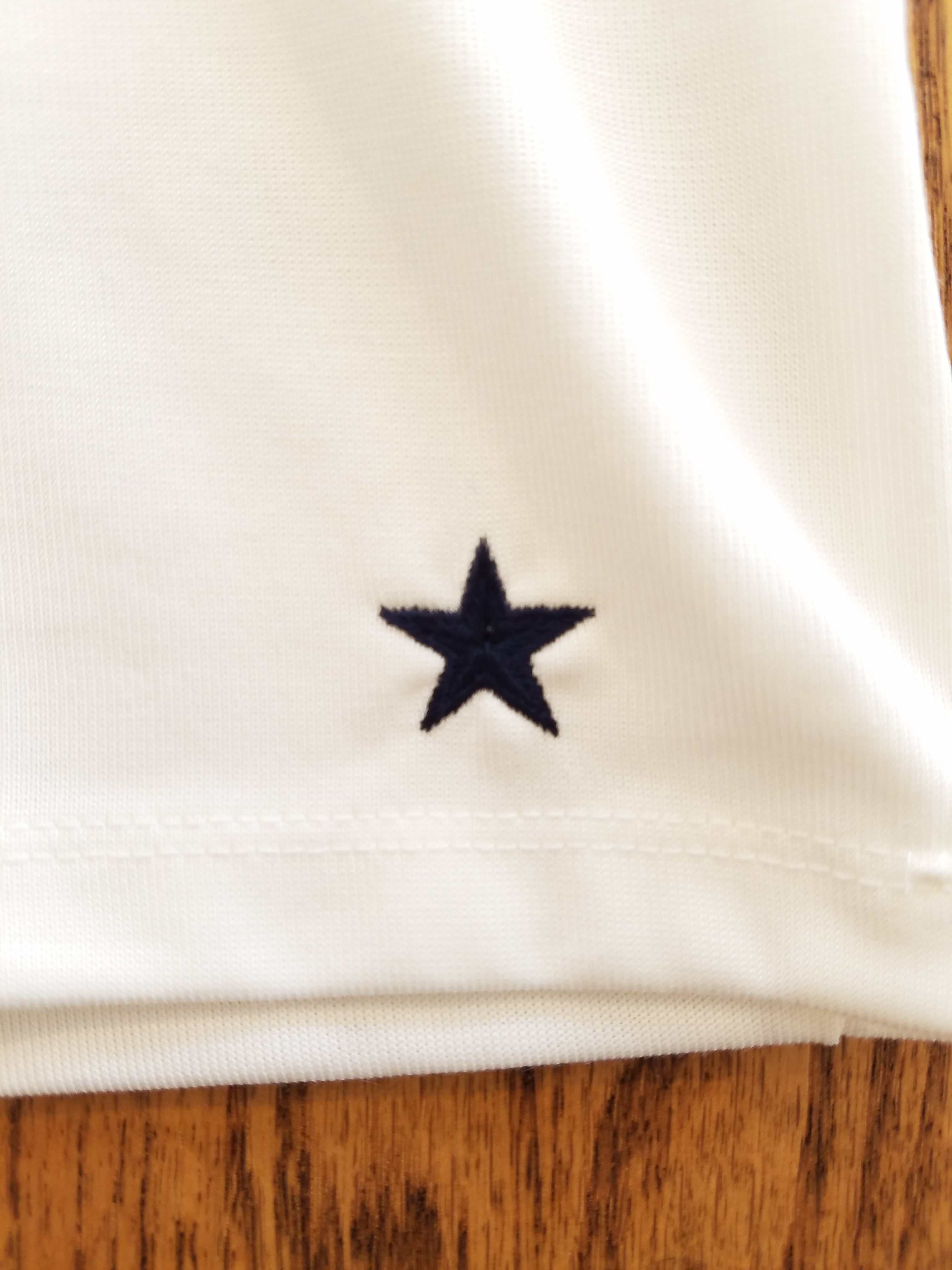 星形の刺繍をイメージカラーであるネイビー色で配しました。裾、袖口のステッチの幅の狭さも、工場を厳選して作っている証です。どのディテイルも日本の工場ならではのキメの細かい気配りから産まれるモノです。