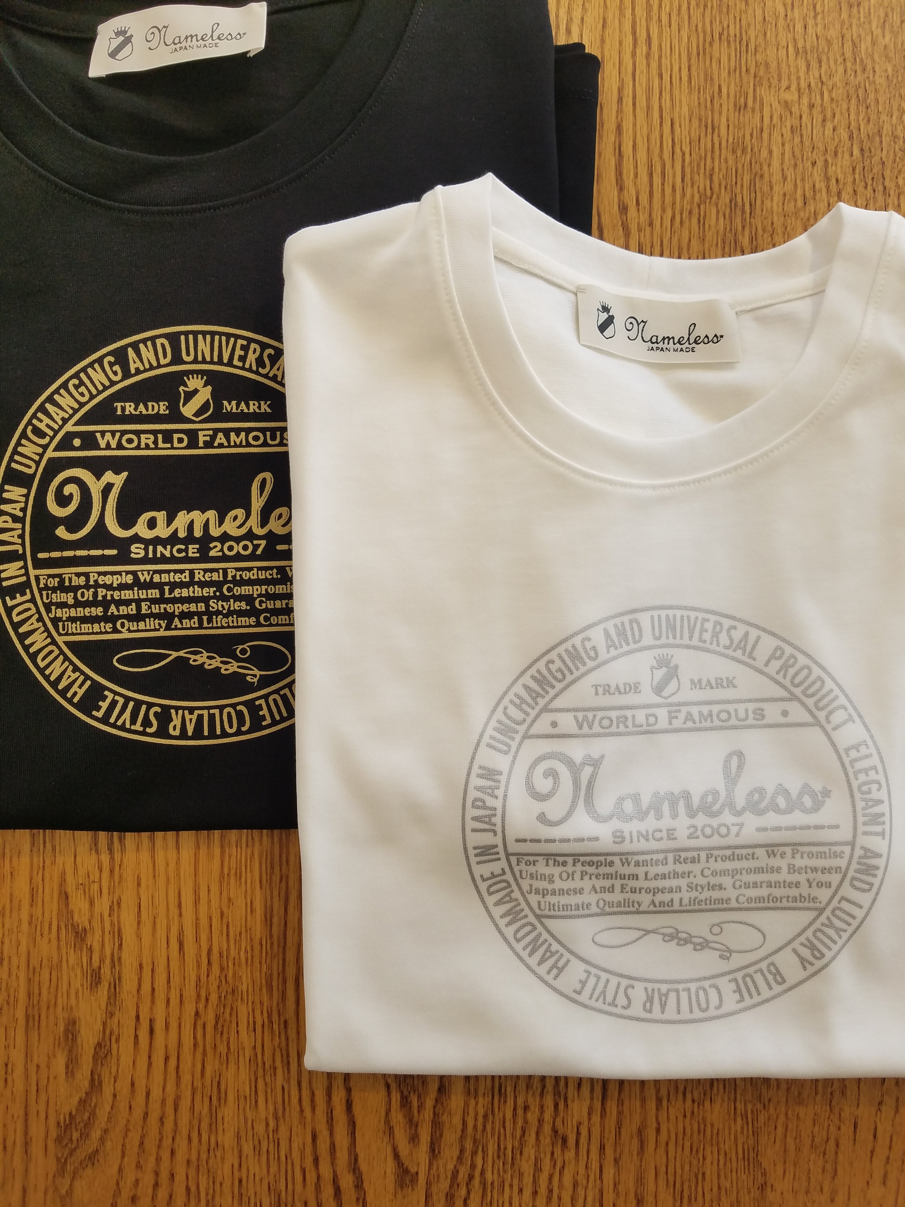 プリントものも製作しました。ホワイトにはシルバープリント。ブラックにはゴールドプリント。シルクスクリーンにて仕上げています。大量生産では味わえないしっかりとしたプリントのノリの良さが見て取れます。
