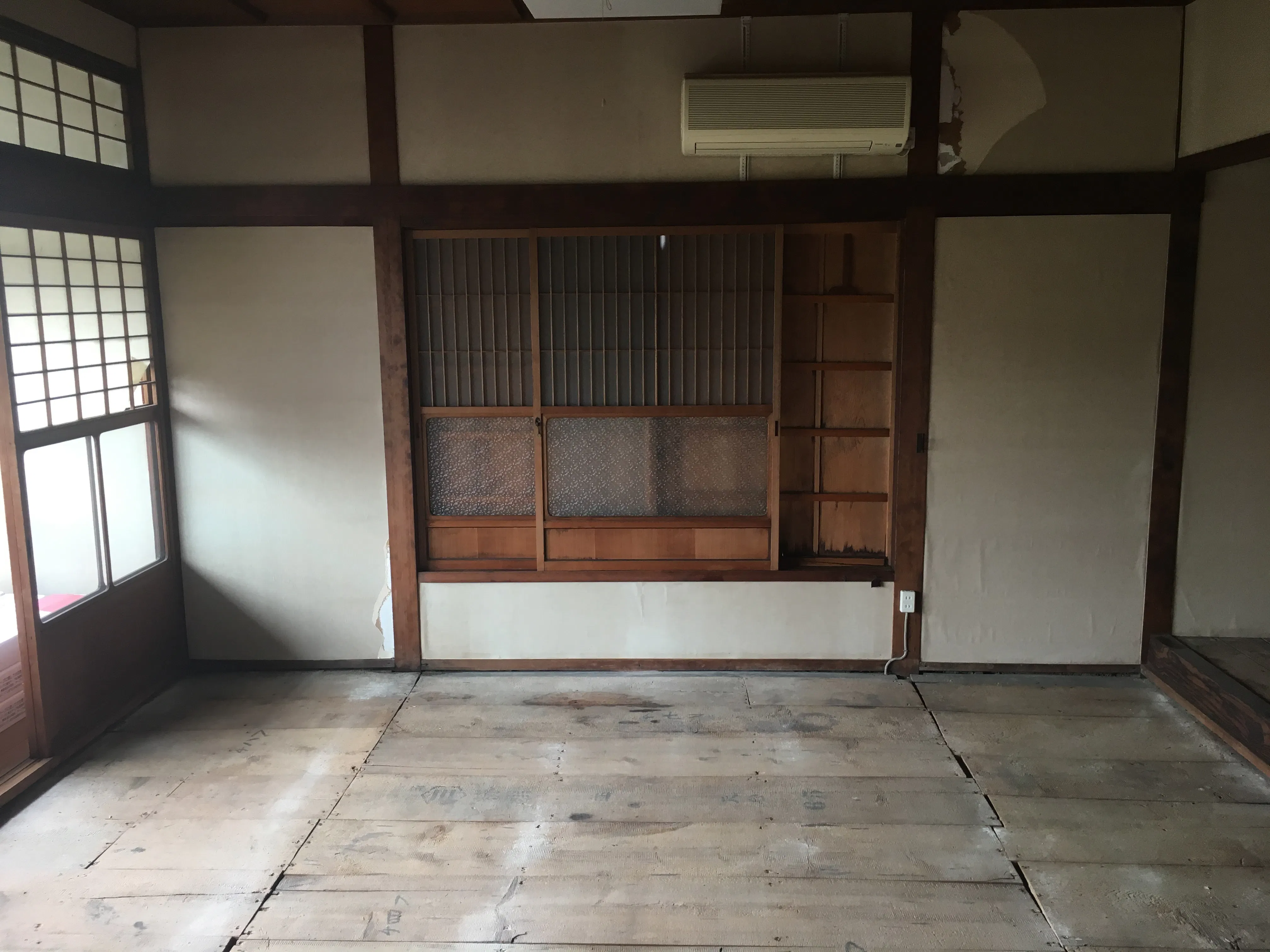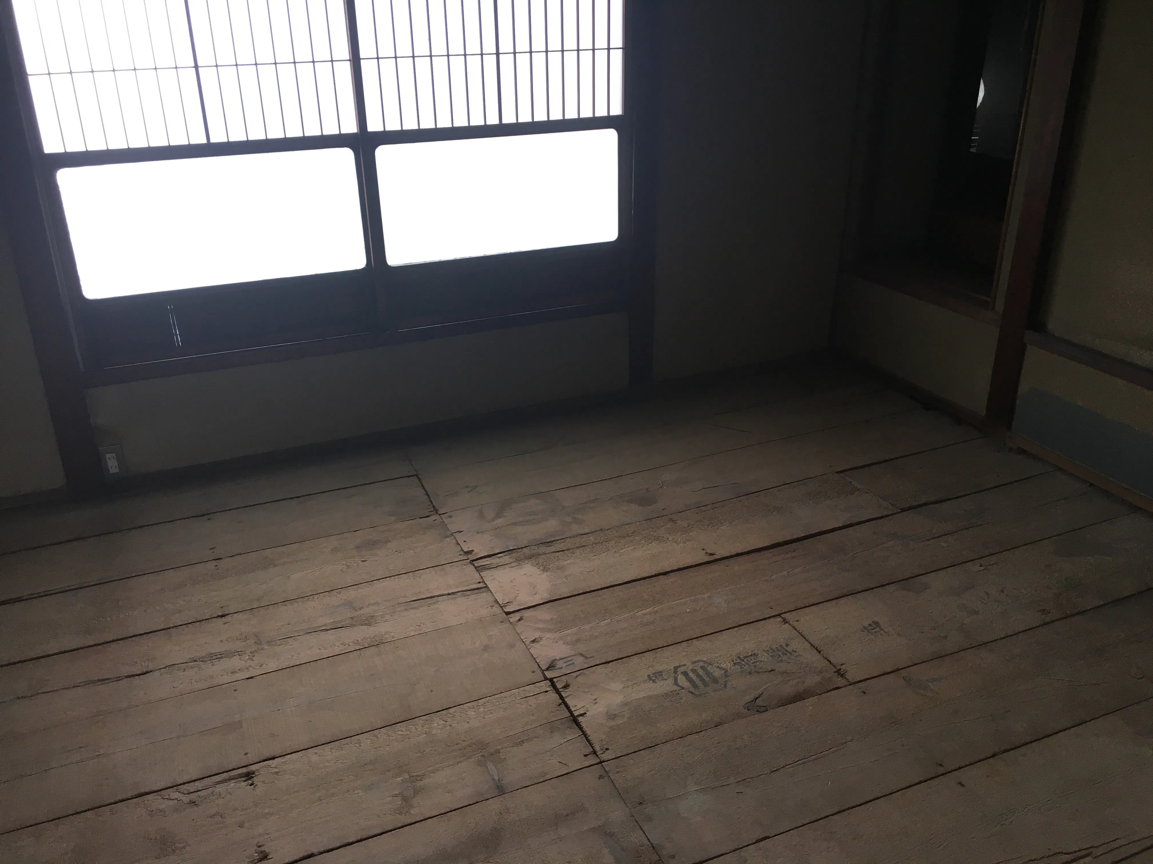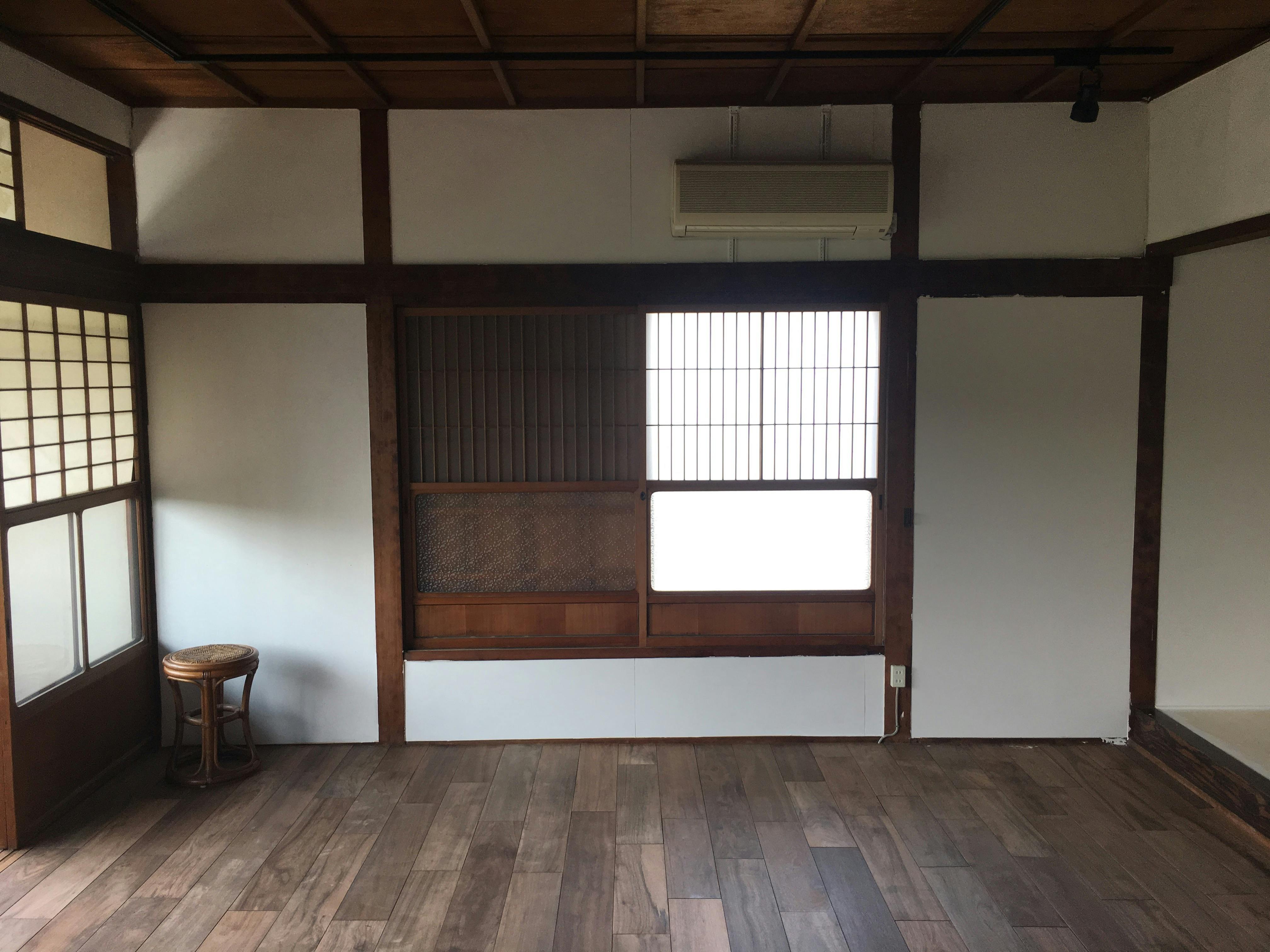 ここの部屋は古い畳からフローリングに変えます。部屋で写真を撮れるスペースにする予定です。 壁等の色塗りはコストを削減する為自分達で仕上げていきます。