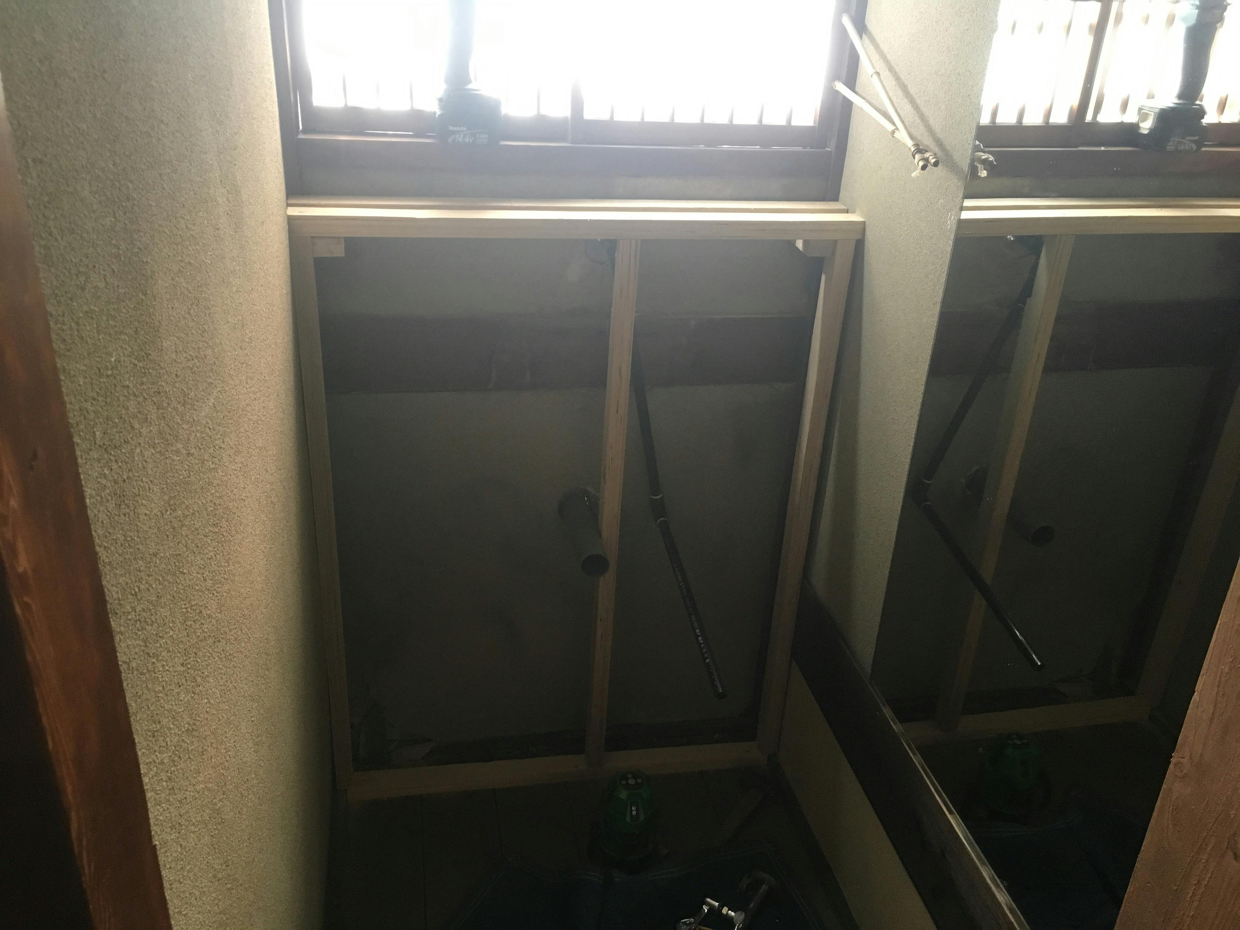 ここも古い畳(藁畳でした……)を処分し新たにフローリングを張ります。壁には新たに薄い板を張り付けて写真等を細い釘で打ち付けれるよう施します。そして天井内にある古い配線も変えます。