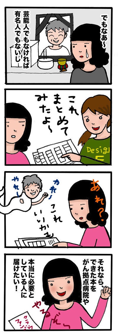 この度は書籍化を実現し、全国にある癌拠点病院や施設等へ寄贈し、この本を必要としている方の元に届けたい!と思いプロジェクトを立ち上げました。母と同じように余命宣告された人や家族の方に、闘病して行く中で悩んだ事や、闘病しながらも立ち上がり好きな仕事を復帰できた母の生き方を読んで、少しでも不安を和らげる事ができたら嬉しく思います。