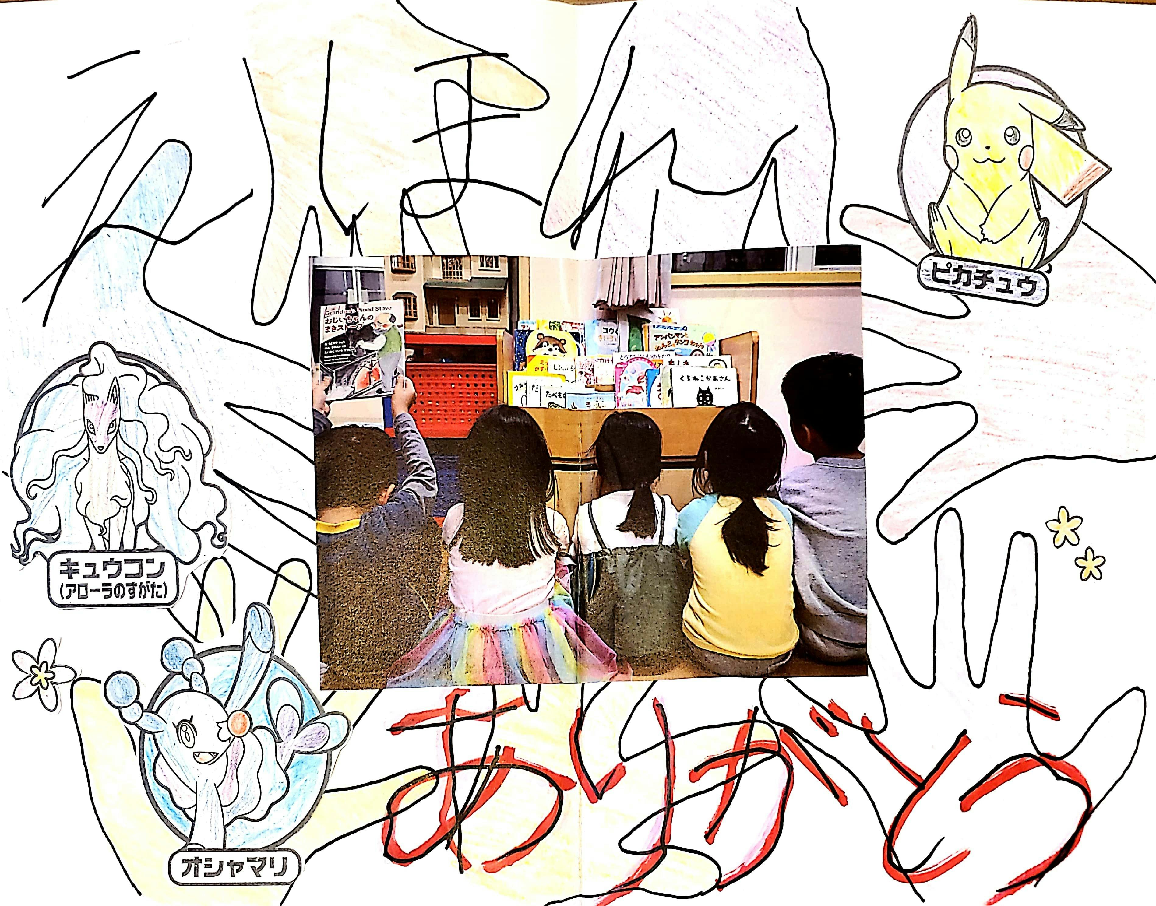 ピカチュウの塗り絵に「えほん ありがとう」のメッセージ。