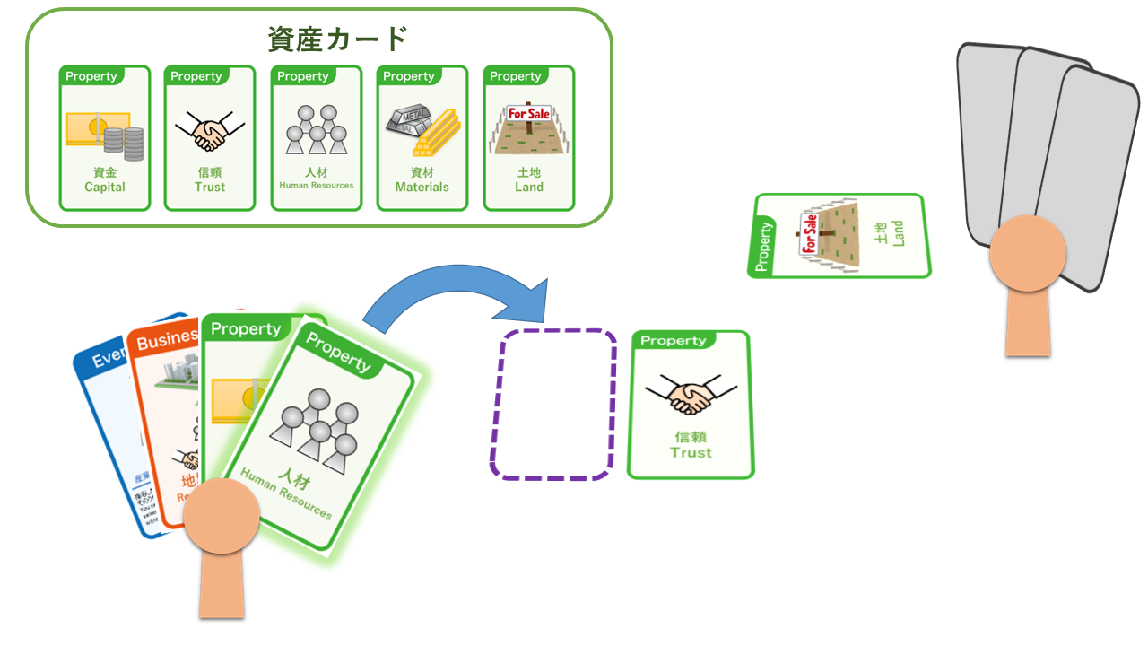 手札の中にある「資金」や「人材」などの資産が描かれたカードを自分の場に置きます。