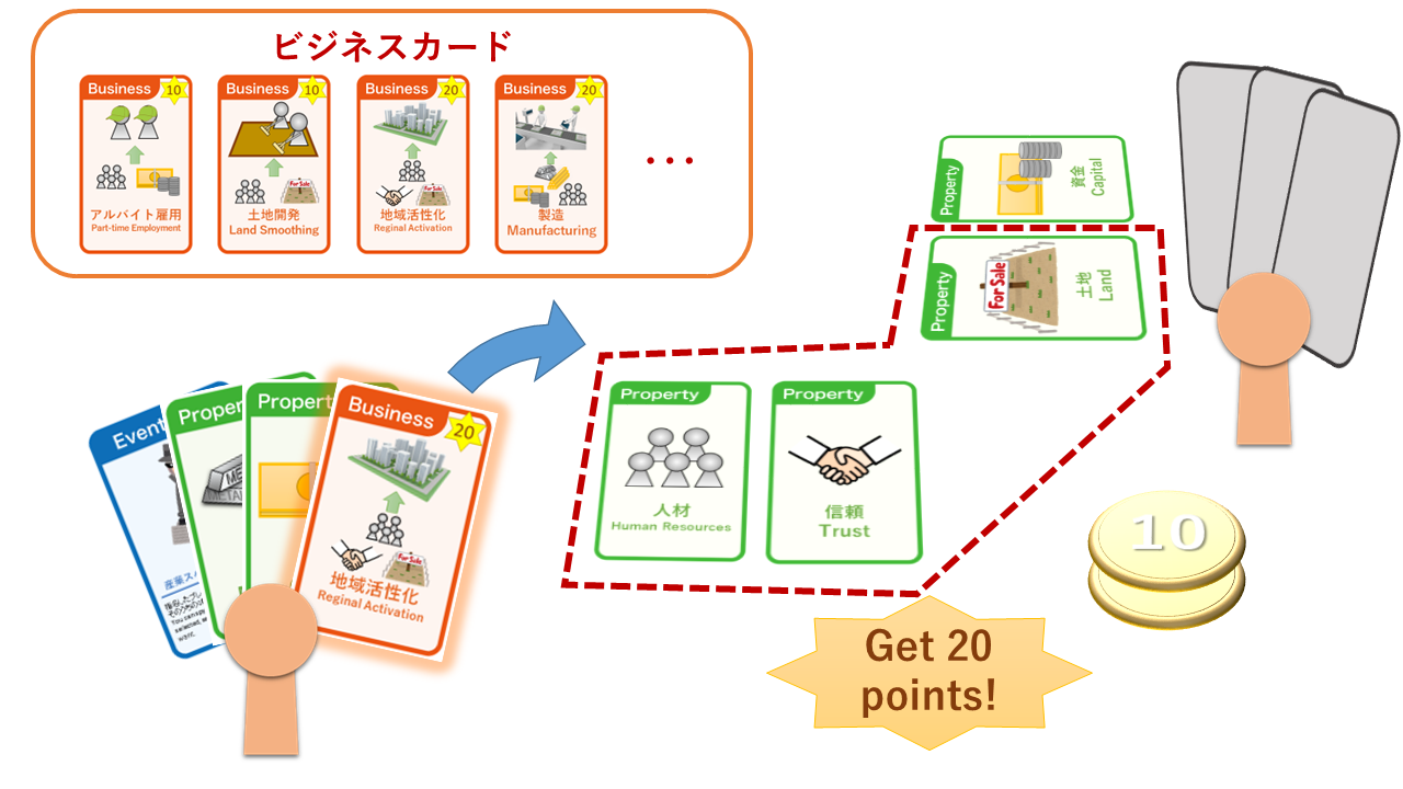 手札の中にある「地域活性化」などのビジネスが描かれたカードを使って収益(スコア)を得ます。