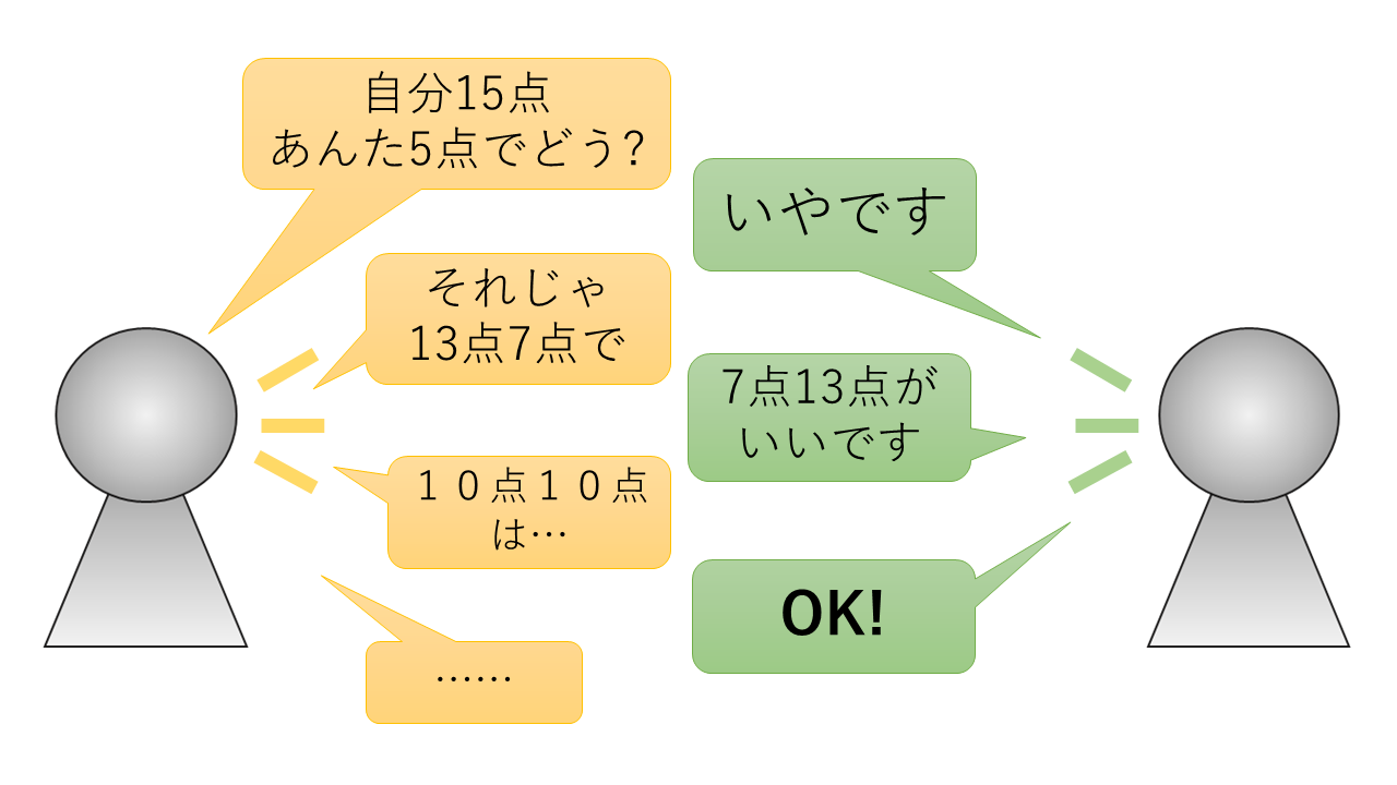 交渉相手の選択や収益の配分に関する決まりごとはありません。臨機応変に、自分が勝てるように相手とうまく交渉しましょう。