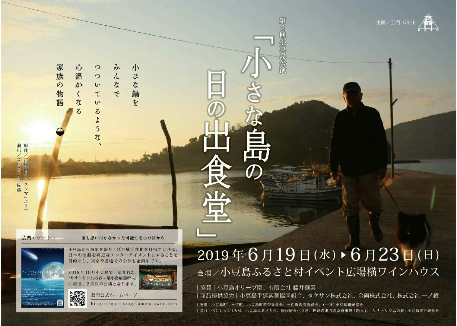 2019/07/10 16:25第2回小豆島公演「小さな島の日の出食堂」無事終演致しました。前回の10月に行われた「サナトリウムの春〜離小島療養所〜」に引き続き、本当に多くの方々のご協力を頂きました。また、ご来場いただいたお客様、遠くからでも本公演に熱いエールを送ってくださった関係者の皆様、本当にありがとうございました。最後まで大きな事故もなく、千秋楽までキャスト、スタッフ全員が笑顔で駆け抜けられたことが、その証拠です。感謝してもしきれません。本当に本当にありがとうございました。この感謝を、次は来月の「サナトリウムの春」にぶつけたいと思います。舞台『サナトリウムの春~離小島療養所』場所:『肥土山農村歌舞伎舞台』日程:2019年8月23日(金)~8月25日(日)全3公演時間:17時30分開場 18時00分開演 上演時間:約1時間40分肥土山農村歌舞伎入口でも当日券を販売しています。チケット料金: 前売り:3,000円 当日:3,500円 中学生以下一律:1,000円更なる出逢いを求めて、芸門は前に進みます。引き続き、よろしくお願い致します。 もっと見る