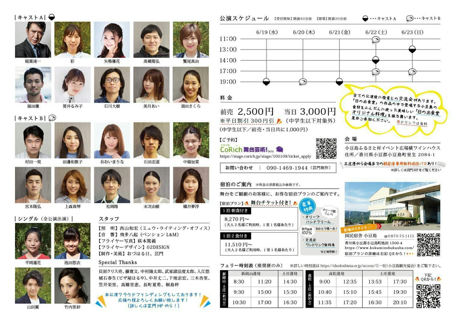 この度、第二回公演を東京で活動するTeamクースーさんの名作『メンマ』をお借りして、小豆島バージョンに修正した『小さな島の 日の出食堂』を6月19日~23日で上演することになりました。