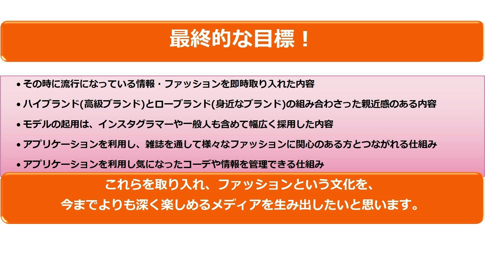 今ある既存のアート的なファッション雑誌(日常で目立ってしまうハイブランドとハイブランドの組み合わせコーデなど)ではなく、親近感のある新しいファッション雑誌(少し背伸びしたハイブランドのアイテムに、リーズナブルなミドルブランドの組み合わせなど)を実現し、更には最終的にこのメディアで新たな体感が出来る仕組みを構築していきたいと思います。