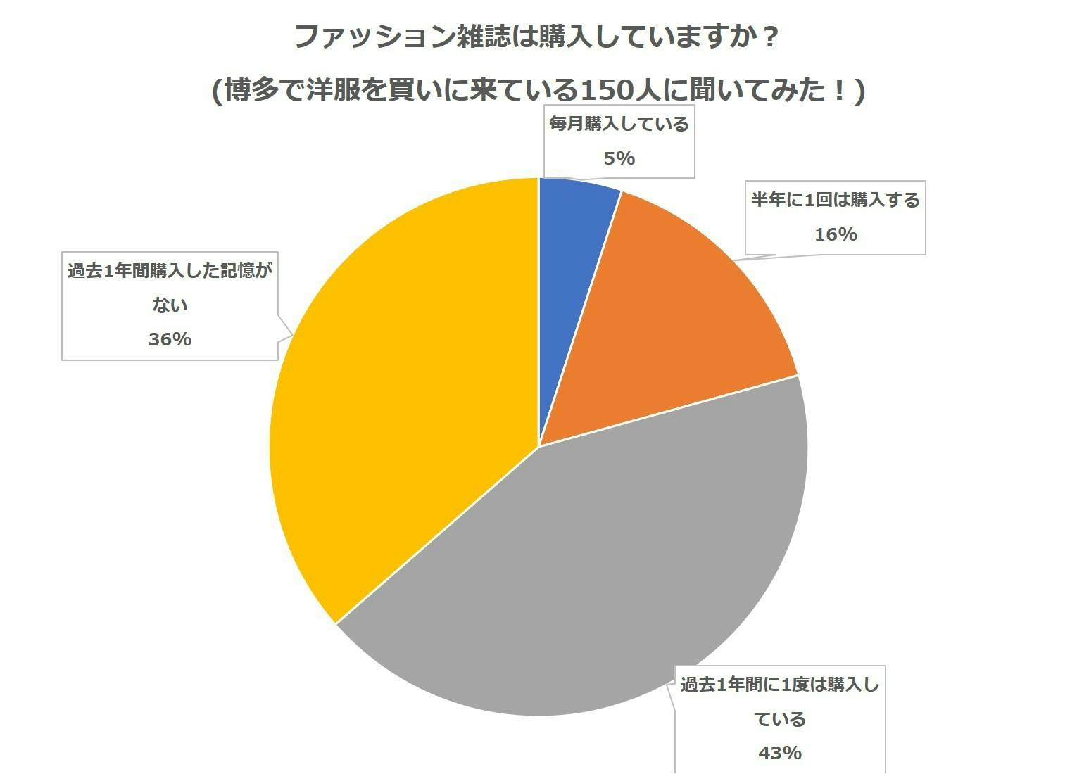 例えば、アイドルが好きな人を私の知人にいます。その方はCDやライブのチケットを買うのは、もちろんのことですが、さらにアイドル情報誌や限定動画コンテンツの有料会員など様々なサービスやプロダクトを購入しています。当然このような人は、よく見かけます。そして「自分はファッションが好きなのに、どうしてファッション情報誌などのプロダクトを購入していないのか。」と疑問に思ったので、当時、福岡にいた中で、洋服の買い物をしているファッションが好きだと答えた人に対して「ファッション雑誌を購入しているか。」と聞いて周りました。結果は、下のグラフの通りで、ほとんどが購入していないんです。