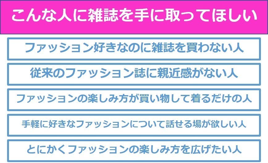 このような人に手に取ってもらえるように、今後広告などが決定次第に、最終目標に記載したような様々な機能を備えていくつもりです。更に、モデルやコーデの採用も”親近感”を重視した選定を行っていく所存です。