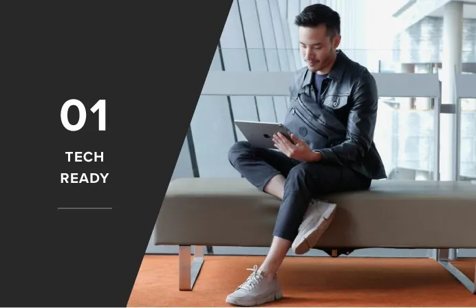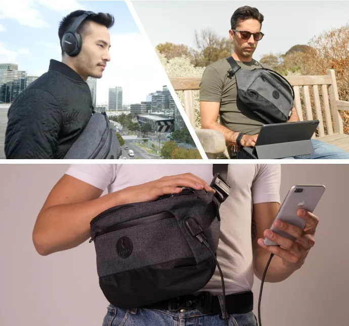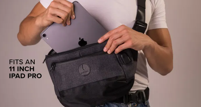 スリングバッグ「Bravo Sling」は、スマホやタブレットなどのハイテクギアの携帯にフォーカスしてデザインされています。11インチのiPad Proがすっきり収納できて、背面は緩衝パッド付きなので、大切なハイテクギアを安全に持ち運べます。また、外側から刺し込めるUSB充電ポートがあるので、バッテリー切れを心配せずにスマホを使用できます。