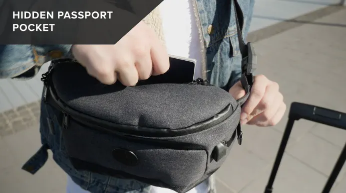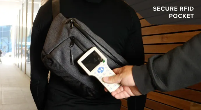 スリングバッグ「Bravo Sling」のポケットは、RFIDをブロックしてスキミングを防止します。