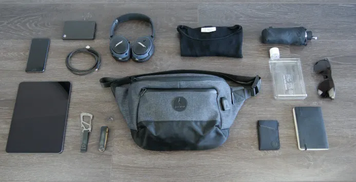 スリングバッグ「Bravo Sling」はスリムな外見に似合わず、こんなにたくさんのものを収納できます。その秘密は、荷物量に応じてマチが3㎝から13㎝まで伸縮する主要コンパートメントとバッグの前面と背面に付いているポケットにあります。
