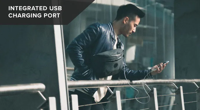 スリングバッグ「Bravo Sling」の本体には外側から刺し込めるUSB充電ポート付き。バッグの中でモバイルバッテリーをUSBケーブルにつないでおけば準備完了。バッグの外側にあるUSB充電ポートにスマホやタブレットをつなぐだけで充電できます。移動中にバッテリー切れの心配は無用です。