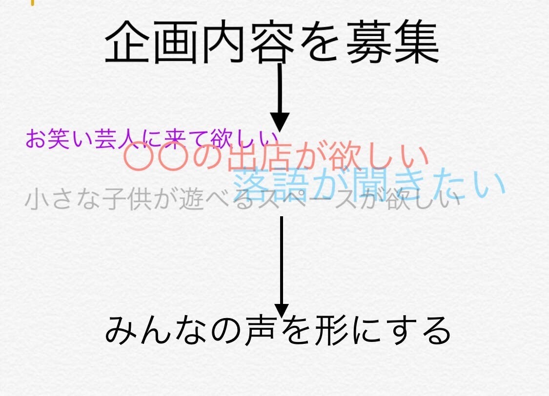 などを「みんなの意見」を取り入れて同会場でエリアごとに開き参加者全員が楽しめるお祭りの制作を考えています。