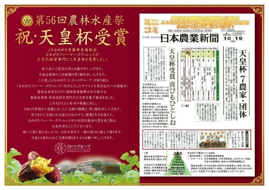 がタッグを組み行ってきたさつまいもの普及拡大への取り組みが称えられ、第56回農林水産祭にて日本最高栄誉となる天皇杯を受賞いたしました。
