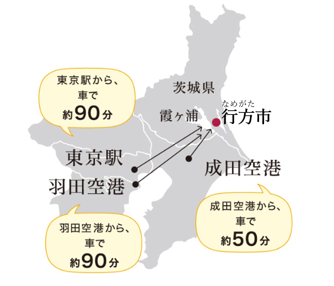 東京駅から車で約80分、大きな湖「霞ヶ浦」に囲まれ、美しい緑・澄んだ空気・・・雄大な自然に囲まれた場所に私たちの行方市は位置します。