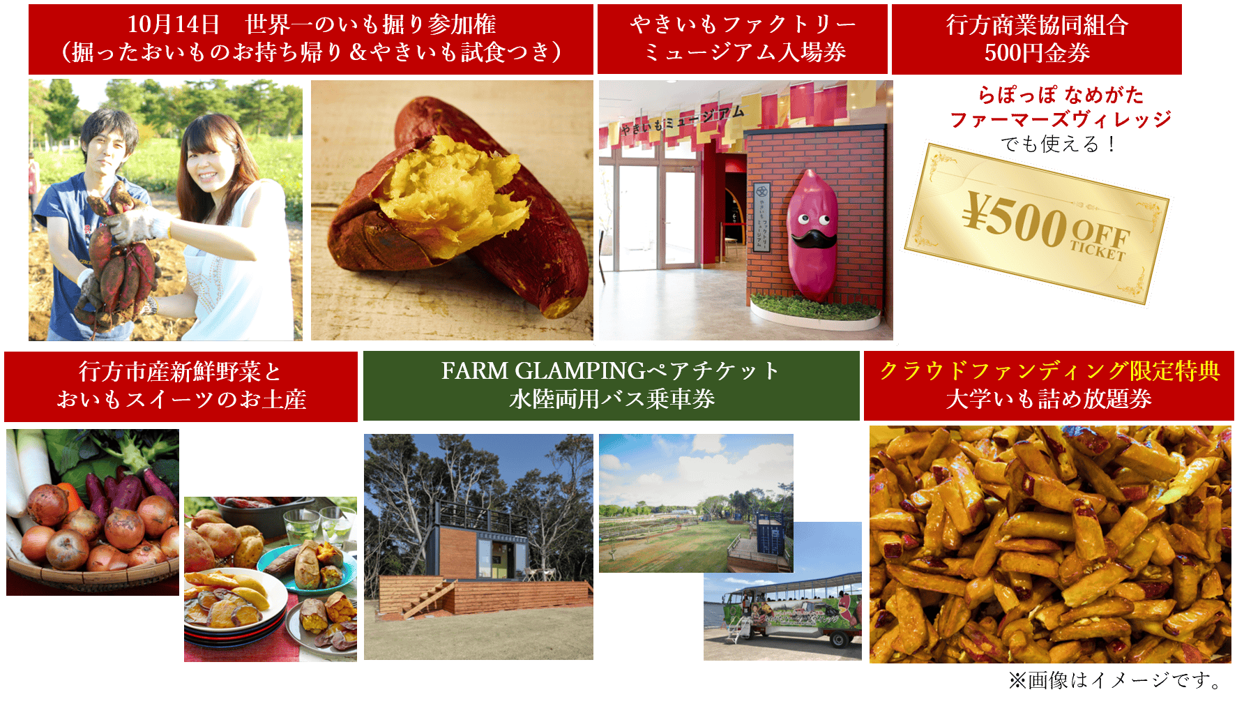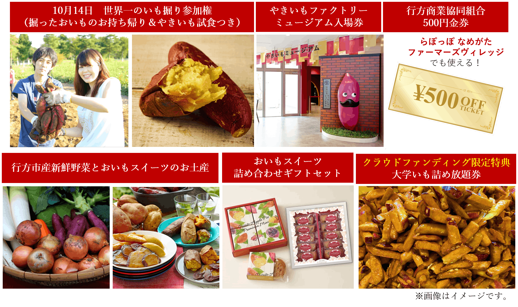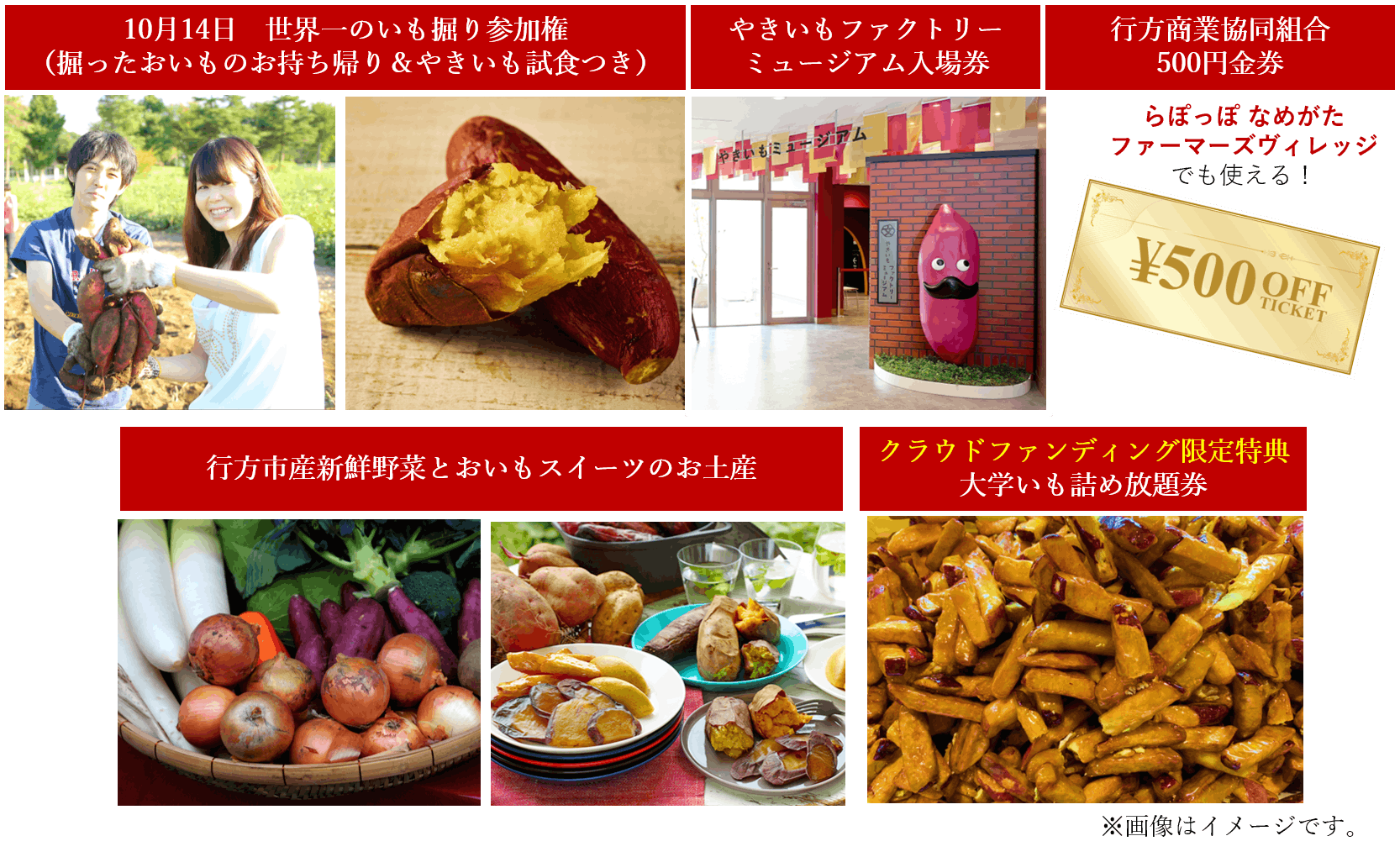 10月14日世界一のいも掘り参加権(掘ったおいもはお土産に)はもちろん、ホクホクあまーいやきいもの試食、やきいもファクトリーミュージアムの入場券、行方商業協同組合で1年間使える500円クーポン券(※なめがたファーマーズヴィレッジ内店舗でも使用可能)、行方市産の新鮮なお野菜とおいもスイーツをお土産にプレゼントいたします。更に、クラウドファンディングからの申込者限定!らぽっぽ なめがたファーマーズヴィレッジの大人気コーナー「大学いも詰め放題」券もプレゼント!