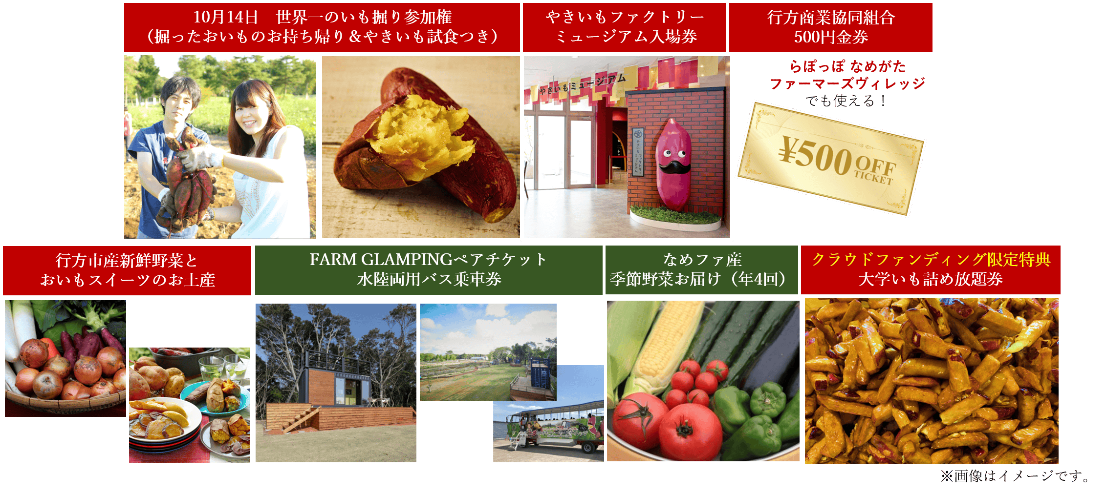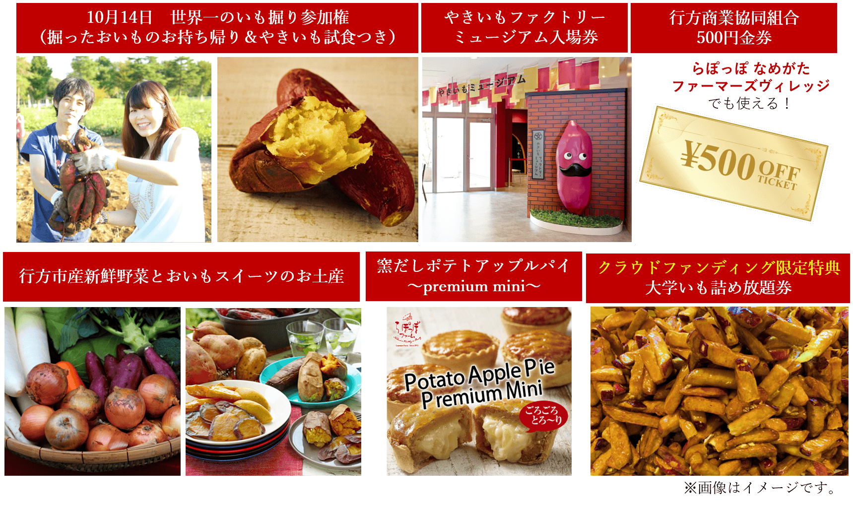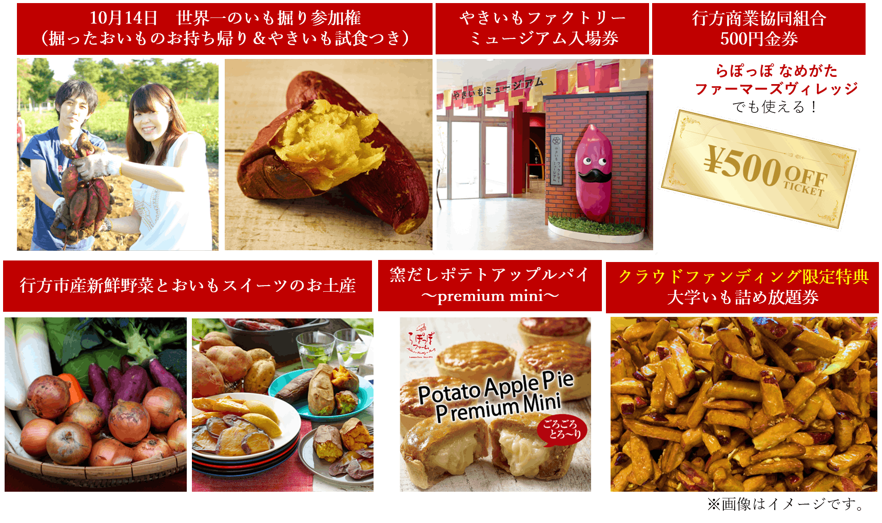 10月14日世界一のいも掘り参加権(掘ったおいもはお土産に)はもちろん、ホクホクあまーいやきいもの試食、やきいもファクトリーミュージアムの入場券、行方商業協同組合で1年間使える500円クーポン券(※なめがたファーマーズヴィレッジ内店舗でも使用可能)、行方市産の新鮮なお野菜とおいもスイーツをお土産にプレゼントいたします。更に、クラウドファンディングからの申込者限定!らぽっぽ なめがたファーマーズヴィレッジの大人気コーナー「大学いも詰め放題」券もプレゼント!