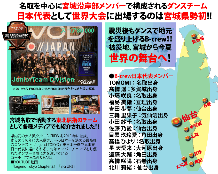 東日本大震災被災地、宮城沿岸部メンバーで構成されたダンスチーム『B-crew』が今夏、宮城初の日本代表チームとしてロサンゼルスで開催される、ダンス世界大会 -WOD- WorldOfDanceに挑戦します。日本中の方にこの活動を通じて世界に挑戦するこどもたち、そして被災地のダンスを是非知ってもらいたい!